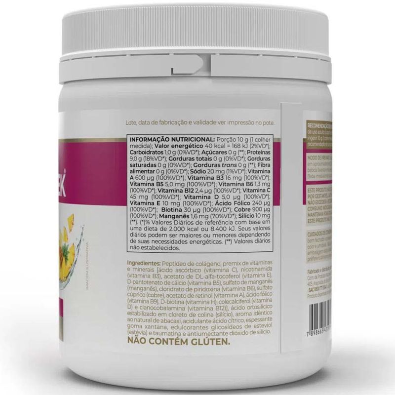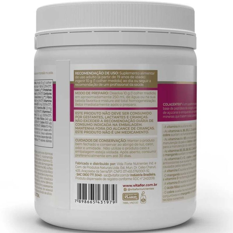 É um suplemento alimentar à base de colágeno hidrolisado, com zero adição de açúcares. Colagentek ® Vitafor é referência em colágeno, quanto a composição, sabor e praticidade no consumo. Pele viva e hidratada. Com o passar dos anos nosso corpo diminui a capacidade de produzir o colágeno, a partir dos 50 anos, apenas 35% do colágeno necessário é produzido. Sendo a proteína mais presente no corpo humano, é natural que com a diminuição do colágeno os sintomas de envelhecimento fiquem mais presentes. A estrutura da pele se modifica, apresentando marcas de expressão. A flexibilidade das articulações diminui, dificultando a locomoção e alongamento. Músculos e ossos também perdem volume com o passar dos anos, deixando nosso corpo mais frágil e suscetível a quedas e fraturas. A pele humana é composta por 70% de colágeno. Estudos indicam que a suplementação com o colágeno ajuda na diminuição de rugas, hidratação da pele e fortalece as unhas. Não é possível impedir a natureza do corpo humano e suas particularidades, mas podemos envelhecer de forma mais saudável através da atividade física, nutrição eficiente e suplementação necessária para complementar o aporte de nutrientes. Colagentek ® Vitafor é referência em colágeno, quanto a composição, sabor e praticidade no consumo. A combinação de 9g de colágeno hidrolisado por porção, associada a vitaminas e minerais precursores de colágeno, promove maior absorção e efetividade no consumo. Benefícios do consumo: A vitamina A auxilia na visão; As vitaminas A, B6, B12, C, D, ácido fólico e o cobre auxiliam no funcionamento do sistema imune; As vitaminas A e B3 contribuem para a manutenção da pele e a biotina e o cobre contribuem para a manutenção do cabelo e da pele; As vitaminas B3, B5, B6, B12, C, biotina, o cobre e o manganês auxiliam no metabolismo energético; A vitamina C auxilia na formação do colágeno; O manganês auxilia na formação de ossos e a vitamina D na formação de ossos e dentes; A vitamina D auxilia no funcionamento muscular; O ácido fólico auxilia na síntese de aminoácidos; O cobre auxilia na manutenção dos tecidos conjuntivos e o manganês na manutenção dos tecidos conectivos.