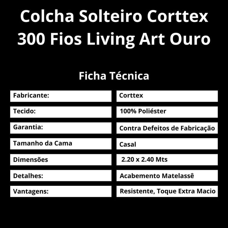 Nada como você chegar em casa e ter um quarto elegante e aconchegante não é mesmo? Conheça a nossa Colcha Ouro Corttex 300 fios Poliéster, confortável, aconchegante e super macia. Com um enchimento leve, pode ser usada para cobrir-se em dias mais quentes. Composto por:1 Colcha Casal 220x240 cm2 Porta Travesseiros 50x70cm Especificações:Marca: CorttexModelo: Living Art OuroTecido: 300 Fios - 100% PoliésterDimensões: 220x240 cmCompatibilidade: Cama CasalForma bolinhas: NãoDesbota: NãoToque: Aconchegante e super macio Tamanho:Largura: 2.20 mComprimento: 2.40 m Vantagens do Produto:Toque macio;Fácil de lavar e guardar. Modo de conservação:Pode ser lavado em máquina;Não secar em secadora;Dispensa passar;Não alvejar.
