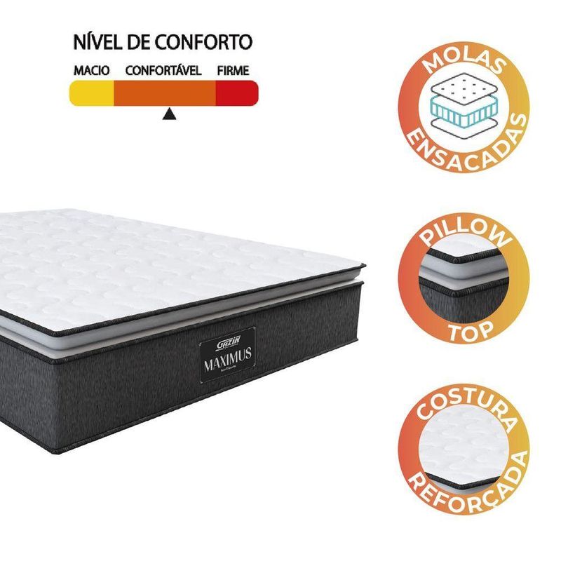Colchão Casal Queen Molas Ensacadas Pillow Top Maximus 158x198x28cm Cinza/branco Gazin - Suporta Até 120kg Por Pessoa Cinza / BrancoVocê merece o melhor quando se trata do seu sono e bem-estar, e por isso o Colchão Maximus se torna a escolha perfeita para o seu quarto! Conta com molas ensacadas individualmente que trabalham em conjunto para garantir conforto e durabilidade, pois desta forma independente, o movimento de uma pessoa não interfere no conforto da outra. Confeccionado em malha matelassê e fibra siliconada que permite melhor ventilação, proporcionando ainda mais conforto, lateral em tecido suede de toque macio e ainda conta com uma camada de pillow top, proporcionando maciez. Invista na qualidade do seu sono e experimente garantia total de descanso e qualidade de vida!MEDIDAS:[ A ] = 28 cm[ L ] = 158 cm[ P ] = 198 cmMODELO: Colchão Casal Queen Molas Ensacadas MaximusMARCA: GazinCOR: Cinza/BrancoREVESTIMENTO SUPERIOR: Matelassê malha + fibra siliconada, tecido que permite melhor ventilação, proporcionando conforto térmico e toque macioREVESTIMENTO LATERAL: Tecido suede macio, especialmente selecionado para garantir uma sensação agradável ao toque e um acabamento sofisticadoREVESTIMENTO INTERIOR: Molas ensacadas que permitem que o colchão suporte até 120kg por pessoa, oferecendo conforto e estabilidade durante o sonoREVESTIMENTO INFERIOR: Tecido antiderrapanteMOLEJO: Molas ensacadas Soft PillowEURO/PILLOW: Pillow TopPOSSUI EPS: SimESPUMA: Camada de espuma D28PESO: 40,86kgPESO SUPORTADO: 120kg por pessoaITENS INCLUSOS: 1 Colchão de 1,58mGARANTIA: 12 Meses pelo FabricanteA Esplanada Móveis se responsabiliza pela entrega dos produtos adquiridos até a porta de entrada ou portaria do endereço indicado, se a portaria do condomínio permitir, as entregas são efetuadas no piso térreo e é de responsabilidade do cliente a locomoção da mercadoria até seu apartamento ou casa. Confira as dimensões do produto e certifique-se de que estão adequadas aos elevadores, portas e corredores do local da entrega. Não fazemos a montagem, desmontagem do produto e/ou portas e janelas, transporte pela escada ou içamento pelo lado de fora do prédio. Não está incluso no serviço de entrega o deslocamento até o interior do apartamento, com ou sem elevador, ou deslocamento em locais de difícil acesso como escadarias. MEDIDAS:: [ A ] = 28 cm [ L ] = 158 cm [ P ] = 198 cm | MODELO:: Colchão Casal Queen Molas Ensacadas Maximus | MARCA:: Gazin | COR:: Cinza/Branco | REVESTIMENTO SUPERIOR:: Matelassê malha + fibra siliconada, tecido que permite melhor ventilação, proporcionando conforto térmico e toque macio | REVESTIMENTO LATERAL:: Tecido suede macio, especialmente selecionado para garantir uma sensação agradável ao toque e um acabamento sofisticado | REVESTIMENTO INTERIOR:: Molas ensacadas que permitem que o colchão suporte até 120kg por pessoa, oferecendo conforto e estabilidade durante o sono | REVESTIMENTO INFERIOR:: Tecido antiderrapante | MOLEJO:: Molas ensacadas Soft Pillow | EURO/PILLOW:: Pillow Top | POSSUI EPS:: Sim | ESPUMA:: Camada de espuma D28 | PESO:: 40,86kg | PESO SUPORTADO:: 120kg por pessoa | ITENS INCLUSOS:: 1 Colchão de 1,58m | GARANTIA:: 12 Meses pelo Fabricante | AVISO:: A Esplanada Móveis se responsabiliza pela entrega dos produtos adquiridos até a porta de entrada ou portaria do endereço indicado, se a portaria do condomínio permitir, as entregas são efetuadas no piso térreo e é de responsabilidade do cliente a locomoçã Cor: Cinza / Branco
