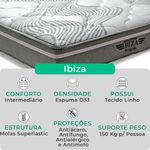 Colchão Ibiza Molas Ensacadas V-store Tamanho Colchão Ibiza 158x198x22A tecnologia que a sua casa merece está na V-Store!O colchão Ibiza é a escolha perfeita para quem busca noites de sono confortáveis e revigorantes. Com Molas Ensacadas e espuma de alta performance, ele oferece o suporte ideal e uma sensação de suavidade, garantindo durabilidade e resistência. Seu design moderno complementa qualquer ambiente, trazendo elegância ao seu quarto. Além disso, o sistema EPS proporciona conforto térmico, otimizando ainda mais a experiência de sono.Com 10 anos de garantia no molejo e 1 ano no estofamento (mediante avaliação técnica), você pode comprar com confiança e tranquilidade.Transforme suas noites com o colchão Ibiza ? adquira o seu agora mesmo!CARACTERÍSTICAS DO PRODUTOModelo: IbizaMarca: V-StoreConforto: intermediárioSistema: Molas EnsacadasPillow: Não se aplicaPeso Máximo recomendado: 150 kg (Por pessoa)Proteções: , , , Garantia: 12 Meses (Espuma) / 10 anos ( Conjunto de Molas Ensacadas)