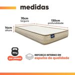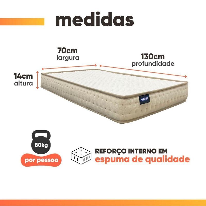 Colchão Infantil Gazin 70x130x14cm Premium BegeO Colchão Infantil Gazin Premium oferece o equilíbrio perfeito entre conforto e qualidade. Revestido em tecido de malha macia nas partes superior e inferior, proporciona um toque suave e agradável. Sua estrutura interna conta com espuma de alta densidade, garantindo o suporte ideal e o bem-estar necessário para o sono tranquilo e saudável das crianças.MEDIDAS:[ A ] = 14 cm[ L ] = 70 cm[ P ] = 130 cmPESO SUPORTADO: 80 kgPESO: 2,42 kgMODELO: Colchão Infantil Gazin 70x130x14cm PremiumMARCA DO COLCHÃO: GazinREVESTIMENTO SUPERIOR E LATERAL: Produzido em tecido de malha de alta qualidade, que proporciona toque suave, conforto prolongado e excelente durabilidade, garantindo uma sensação agradável durante o descanso.REVESTIMENTO INTERNO: Camada de espuma D18 dentro dos padrões ABNT, de alta qualidade que proporciona conforto na medida certaNÍVEL DE CONFORTO: MacioDIFERENCIAL: Desenvolvido para oferecer o máximo conforto e bem-estar, o Colchão Infantil Gazin Premium se destaca pelo tecido em malha de alta qualidade, que proporciona toque suave e respirável. Sua estrutura garante maciez na medida certa e durabilidade superior, assegurando noites tranquilas e aconchegantes para os pequenos.ITENS INCLUSOS: 1 Colchão infantil ( 70 cm)GARANTIA: 12 MesesImportante sobre a entrega: A entrega é realizada até a portaria ou porta de entrada do endereço indicado, desde que o acesso seja permitido. Para locais com portaria, a entrega será feita no piso térreo. Não realizamos montagem, desmontagem, transporte por escadas ou içamento. É responsabilidade do cliente verificar se as dimensões do produto são compatíveis com portas, elevadores e corredores. Evite imprevistos: confira todos os detalhes antes de concluir sua compra. MEDIDAS:: [ A ] = 14 cm [ L ] = 70 cm [ P ] = 130 cm | PESO SUPORTADO:: 80 kg | PESO:: 2,42 kg | MODELO:: Colchão Infantil Gazin 70x130x14cm Premium | MARCA DO COLCHÃO:: Gazin | REVESTIMENTO SUPERIOR E LATERAL:: Produzido em tecido de malha de alta qualidade, que proporciona toque suave, conforto prolongado e excelente durabilidade, garantindo uma sensação agradável durante o descanso. | REVESTIMENTO INTERNO:: Camada de espuma D18 dentro dos padrões ABNT, de alta qualidade que proporciona conforto na medida certa | NÍVEL DE CONFORTO:: Macio | DIFERENCIAL:: Desenvolvido para oferecer o máximo conforto e bem-estar, o Colchão Infantil Gazin Premium se destaca pelo tecido em malha de alta qualidade, que proporciona toque suave e respirável. Sua estrutura garante maciez na medida certa e durabilidade superior, a | ITENS INCLUSOS:: 1 Colchão infantil (70 cm) | GARANTIA:: 12 Meses | AVISO:: Importante sobre a entrega: A entrega é realizada até a portaria ou porta de entrada do endereço indicado, desde que o acesso seja permitido. Para locais com portaria, a entrega será feita no piso térreo. | Altura: 14 cm | Comprimento: 130 cm | É colchão na caixa: Não | Largura: 70 cm | Tamanho do colchão: Infantil | Altura da embalagem: 14 cm | Comprimento da embalagem: 130 cm | Largura da embalagem: 70 cm | Peso da embalagem: 5 g | Cor: Bege