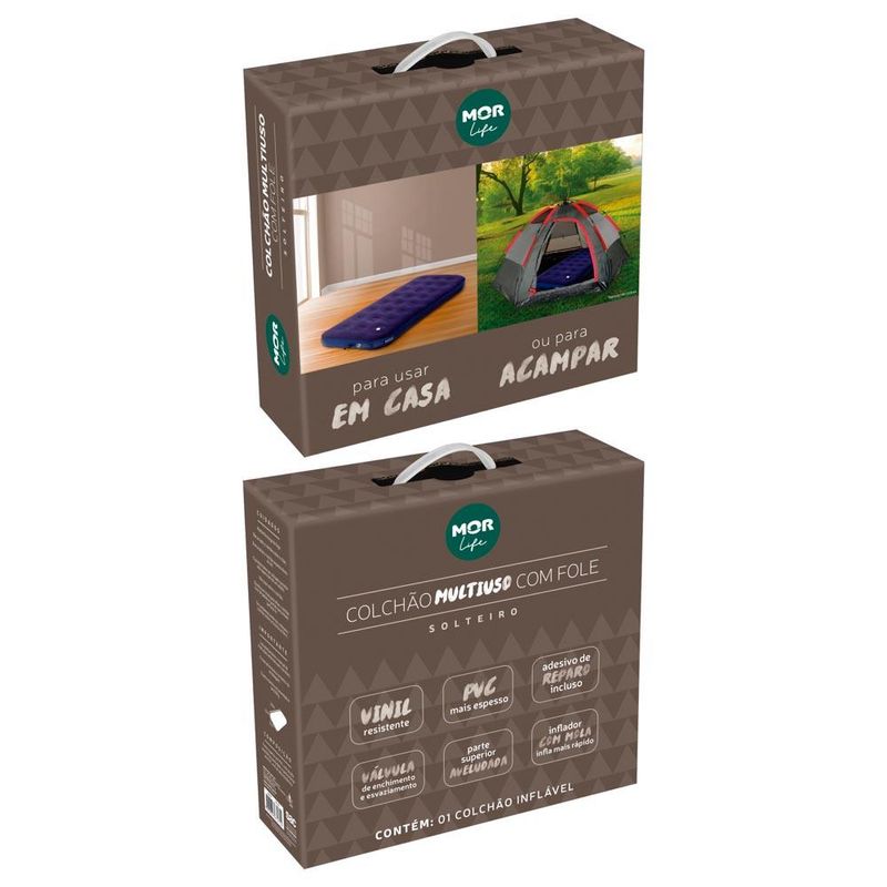 Colchão Inflável de Solteiro Com Inflador Acoplado Mor O Colchão Multiuso Solteiro Mor possui excelente qualidade. Ele é produzido em PVC resistente pré-testado, mais espesso em toda sua estrutura. Conta com revestimento aveludado na parte superior que torna sua superfície extremamente confortável e facilita a aderência do lençol ou dispensa sua utilização. Além disso, suas ondulações proporcionam o ajuste do corpo, oferecendo um descanso agradável e adequado para diversas situações. O Colchão Mor possui inflador acoplado com sistema de fole que facilita seu enchimento de maneira rápida e válvula de enchimento e esvaziamento com sistema de fechamento seguro que evita o vazamento de ar. Compacto para guardar, acompanha prática embalagem com alça para facilitar seu transporte para qualquer lugar e também um Kit de Reparo para que pequenos acidentes sejam resolvidos facilmente. Super funcional, o Colchão Multiuso Solteiro é perfeito para servir como cama extra para receber suas visitas, acomodar as crianças para brincarem, assistir seus filmes favoritos em qualquer lugar da casa, utilizar em acampamentos ou onde você precisar! Suas medidas são 1,85m de comprimento e 76cm de largura com 22cm de altura e capacidade para suportar até 100 Kg. Um produto Mor que garante momentos de conforto com o mínimo de esforço! Descrição do produto Marca: Mor Material: PVC Capacidade: 100 kg Altura: 22 cm Largura: 76 cm Comprimento: 1,85 m Peso: 1,68 kg Imagens meramente ilustrativas, todos os itens que ambientam o produto não estão inclusos.