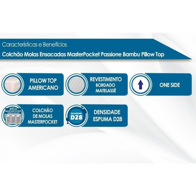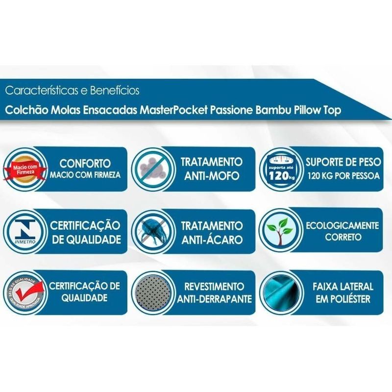 Colchão King Molas Ensacadas Masterpocket Passione Bambu Pillow Top (193x203x26) - ProbelCOLCHÃO KING MOLAS ENSACADAS MASTERPOCKET PASSIONE BAMBU PILLOW TOP (193X203X26) - PROBELMarca: ProbelDimensões(Cm): Colchão Molas Ensacadas MasterPocket Passione Bambu Pillow TopComprimento(Profundidade): 203 cmLargura: 193 cmAltura: 26 cm Suporte de Peso: - 120 kg Espuma de Estofamento: - Alta Qualidade, AG Nível de Firmeza do Colchão: - Macio c/ Firmeza Tipo de Estrutura Interna: - AG Tipo de Espuma: - Espuma de Poliuretano de Alta Qualidade Densidade da Espuma: - D28 Tipo de Mola: - Ensacadas MasterPocket Tipo de Colchão: - Molas Benefícios Extras de Colchão: - Ecologicamente Correto, Reforço Polyframe nas bordas, Manta Acrílica Tecido com Tratamento: - Antiácaro e Antifungo Tipo do Bordado do Tecido: - Matelassê Características do Tecido: - Malha de Alta Qualidade Tipo de Forração do Revestimento Inferior: - Antiderrapante Tecido da Faixa Lateral: - Poliéster Tipo de Pillow: - Pillow Top Americano Modo de Utilização: - One Side Certificação de Qualidade: - INMETRO, Qualidade Costa Rica Nossa Avaliação: - Qualidade Boa Tempo de Garantia: - 3 mesesImagens Meramente Ilustrativas.Não nos responsabilizamos pela montagem/instalação dos produtos.Todas as informações divulgadas são de responsabilidade exclusiva do fabricante/fornecedor. Forração Revestimento do Colchão: Malha de Alta Qualidade | Nível de Firmeza do Colchão: Macio c/ Firmeza | Nossa Avaliação do Colchão: Qualidade Boa | Peso Máximo Suportado do Colchão: 120 kg | Tempo de Garantia do Colchão: 3 meses | Vantagens Extras de Colchão: Ecologicamente Correto | Certificação de Qualidade do Colchão: INMETRO | Tipo de Estrutura Ortopédico do Colchão: AG | Tecido de Revestimento da Faixa Lateral do Colchão: Poliéster | Bordado do Revestimento do Colchão: Matelassê | Tecido com Tratamento do Colchão: Antiácaro e Antifungo | Tipo de Pillow: Pillow Top Americano | Modo de Utilização do Colchão: One Side | Forração do Revestimento Inferior do Colchão: Antiderrapante | Camadas Interna do Estofamento de Espuma do Colchão: Alta Qualidade | Garantia Complementar de Fábrica após Prazo Legal?: Garantia de Fábrica | Com pillow top: Sim | Tipo de Colchão: Molas | Tipo de Mola do Colchão: Ensacadas MasterPocket | Densidade da Espuma do Colchão: D28 | É duplo pillow: Não | É eco-friendly: Sim | Está embalado a vácuo: Não | Com função de massagem: Não | Possui Memory Foam (Espuma Viscoelástica): Não | É hipoalergênica: Sim | É antiácaros: Sim | Este Produto Inclui Travesseiro: Não | Com alta densidade: Sim | Este Colchão é Magnético: Não | Inclui controle remoto: Não | É colchão na caixa: Não | É Antifungos?: Sim | Requer montagem: Não | Inclui manual de montagem: Não | Tipo de Espuma do Colchão: Espuma de Poliuretano de Alta Qualidade | Com memoria: Não | É inteligente: Não | É antihongos: Sim | É produto personalizado: Não | Desenho do tecido: N/A | Tipo de pillow do colchão: Pillow top | Composição do tecido: Poliéster | Com moldura perimetral: Sim | É one side: Sim | Firmeza: Firme | Tipo de Produto: N/A | Estrutura do Colchão: Mola Ensacada | Tipo do Colchão: Padrão | É kit?: Não | É resistente à água: Não | É Lavável?: Não | Fonte do produto: N/A | Código universal de produto (GTIN): 7899108617325 | Descrição do Tamanho: 26.00x:193.00x203.00 cm | Estado de Origem: RJ | Dimensões: 193.00 cm x 26.00 cm x 203.00 cm | País de origem: Nacional | Peso Produto Com Embalagem (Kg): 61.12 | Material para Filtro: N/I | Condição do Item: Novo | Link Site: https://www.costaricacolchoes.com.br/produtos/50656S236/ | Numeral: 0 | Não se Aplica: N/A | Não Possui: Não | Linha/Modelo: Probel | Cor Cnova: Blush | Cor Meli: Ciano | Contatos Sac Fábrica: assistenciatecnica@probelmercosul.com.br | Categoria Trilha: Colchão> Colchão de Molas Ensacadas | Categoria - Sub: Colchão de Molas Ensacadas | Categoria - Pai: Colchão | Comprimento Embalagem: 203.00 | Largura Embalagem: 193.00 | Altura Embalagem: 26.00 | Kit: 0 | Peso: 61.12 Kg | Peso Real Kg: 61.12 | Peso Cubado: 254.66 | Volumes: 1 | M3: 1.02 | Comprimento/Profundidade: 203 cm | Largura: 193 cm | Altura: 26 cm | Tamanho Montado: Larg:193.00 x Comp/Prof:203.00 x Alt: 26.00 | Comprimento/Profundidade Montado: 203.00 | Largura Montado: 193.00 | Altura Montado: 26.00 | MPN: PA66413 | Tamanho Cama Colchão: King | Marca: Probel | Fabricante: Probel | Linha: Probel