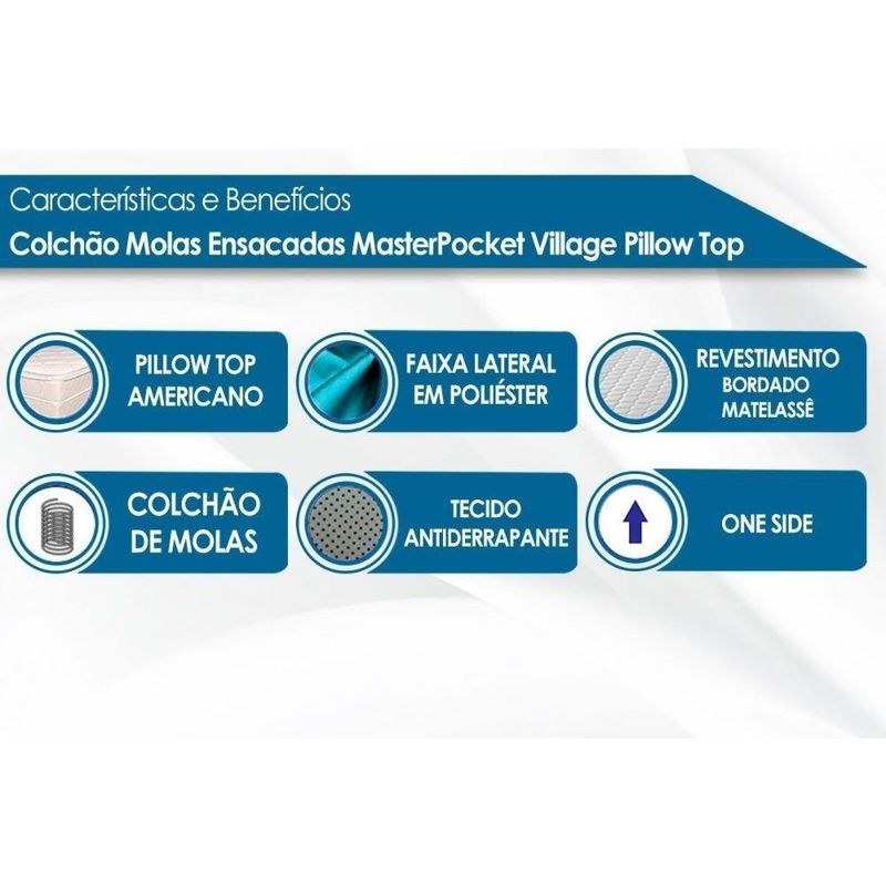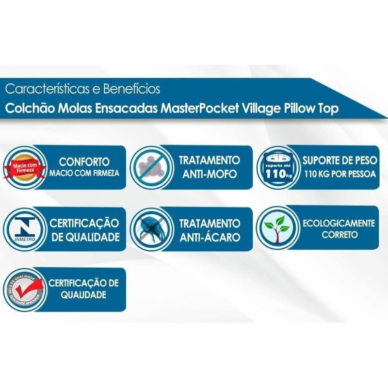 Colchão King Molas Ensacadas Masterpocket Village Pillow Top (193x203x30) - ProbelCOLCHÃO KING MOLAS ENSACADAS MASTERPOCKET VILLAGE PILLOW TOP (193X203X30) - PROBELMarca: ProbelDimensões(Cm): Colchão Molas Ensacadas MasterPocket Village Pillow TopComprimento(Profundidade): 203 cmLargura: 193 cmAltura: 28 cm Espuma de Estofamento: - Alta Qualidade, D28 Suporte de Peso: - 110 kg Nível de Firmeza do Colchão: - Macio c/ Firmeza Tipo de Estrutura Interna: - EPS Estrutura Bloco de Espuma: - Poliuretano, EPS Tipo de Espuma: - Espuma de Poliol Vegetal, Espuma de Poliuretano de Alta Qualidade Tipo de Mola: - Ensacadas MasterPocket Tipo de Colchão: - Molas Benefícios Extras de Colchão: - Ecologicamente Correto, Reforço Polyframe nas bordas, Manta Acrílica Tecido com Tratamento: - Antiácaro e Antifungo Características do Tecido: - Malha de Alta Qualidade Tipo do Bordado do Tecido: - Matelassê Tipo de Forração do Revestimento Inferior: - Antiderrapante Tecido da Faixa Lateral: - Poliéster Tipo de Pillow: - Pillow Top Americano Modo de Utilização: - One Side Certificação de Qualidade: - INMETRO Nossa Avaliação: - Qualidade Boa Tempo de Garantia: - 3 mesesImagens Meramente Ilustrativas.Não nos responsabilizamos pela montagem/instalação dos produtos.Todas as informações divulgadas são de responsabilidade exclusiva do fabricante/fornecedor. Forração Revestimento do Colchão: Malha de Alta Qualidade | Tipo de Estrutura do Bloco de Espuma do Colchão: Poliuretano | Nível de Firmeza do Colchão: Macio c/ Firmeza | Nossa Avaliação do Colchão: Qualidade Boa | Peso Máximo Suportado do Colchão: 110 kg | Tempo de Garantia do Colchão: 3 meses | Vantagens Extras de Colchão: Ecologicamente Correto | Certificação de Qualidade do Colchão: INMETRO | Tipo de Estrutura Ortopédico do Colchão: EPS | Tecido de Revestimento da Faixa Lateral do Colchão: Poliéster | Bordado do Revestimento do Colchão: Matelassê | Tecido com Tratamento do Colchão: Antiácaro e Antifungo | Tipo de Pillow: Pillow Top Americano | Modo de Utilização do Colchão: One Side | Forração do Revestimento Inferior do Colchão: Antiderrapante | Camadas Interna do Estofamento de Espuma do Colchão: Alta Qualidade | Garantia Complementar de Fábrica após Prazo Legal?: Garantia de Fábrica | Com pillow top: Sim | Tipo de Colchão: Molas | Tipo de Mola do Colchão: Ensacadas MasterPocket | É duplo pillow: Não | É eco-friendly: Sim | Está embalado a vácuo: Não | Com função de massagem: Não | Possui Memory Foam (Espuma Viscoelástica): Não | É hipoalergênica: Sim | É antiácaros: Sim | É ortopédico: Não | Este Produto Inclui Travesseiro: Não | Com alta densidade: Sim | Este Colchão é Magnético: Não | Inclui controle remoto: Não | É colchão na caixa: Não | É Antifungos?: Sim | Com aromaterapia: Não | Requer montagem: Não | Inclui manual de montagem: Não | Tipo de Espuma do Colchão: Espuma de Poliol Vegetal | Com memoria: Não | É inteligente: Não | É antihongos: Sim | É produto personalizado: Não | Desenho do tecido: N/A | Tipo de pillow do colchão: Pillow top | Com moldura perimetral: Sim | É one side: Sim | Firmeza: Macia | Número de registro/certificação INMETRO: N/A | Tipo de Produto: N/A | Estrutura do Colchão: Mola Ensacada | Tipo do Colchão: Padrão | É kit?: Não | É resistente à água: Não | É Lavável?: Não | Fonte do produto: N/A | Código universal de produto (GTIN): 7899108616984 | Descrição do Tamanho: 28.00x:193.00x203.00 cm | Estado de Origem: RJ | Dimensões: 193.00 cm x 28.00 cm x 203.00 cm | País de origem: Nacional | Peso Produto Com Embalagem (Kg): 86.98 | Material para Filtro: N/I | Condição do Item: Novo | Link Site: https://www.costaricacolchoes.com.br/produtos/50640S213/ | Numeral: 0 | Não se Aplica: N/A | Não Possui: Não | Linha/Modelo: Probel | Cor Cnova: Blush | Cor Meli: Ciano | Contatos Sac Fábrica: assistenciatecnica@probelmercosul.com.br | Categoria Trilha: Colchão> Colchão de Molas Ensacadas | Categoria - Sub: Colchão de Molas Ensacadas | Categoria - Pai: Colchão | Comprimento Embalagem: 203.00 | Largura Embalagem: 193.00 | Altura Embalagem: 28.00 | Peso: 86.98 Kg | Kit: 0 | Peso Real Kg: 86.98 | Peso Cubado: 362.41 | Volumes: 1 | M3: 1.45 | Comprimento/Profundidade: 203 cm | Largura: 193 cm | Altura: 28 cm | Tamanho Montado: Larg:193.00 x Comp/Prof:203.00 x Alt: 28.00 | Comprimento/Profundidade Montado: 203.00 | Largura Montado: 193.00 | Altura Montado: 28.00 | MPN: PA37425 | Tamanho Cama Colchão: King | Marca: Probel | Fabricante: Probel | Linha: Probel