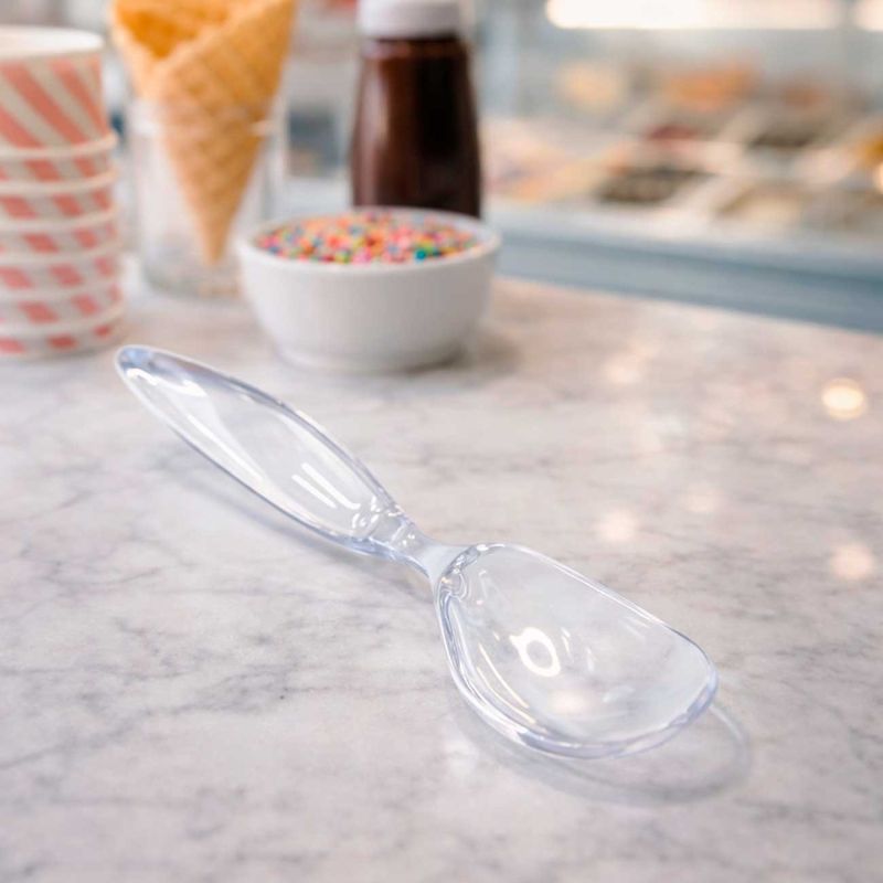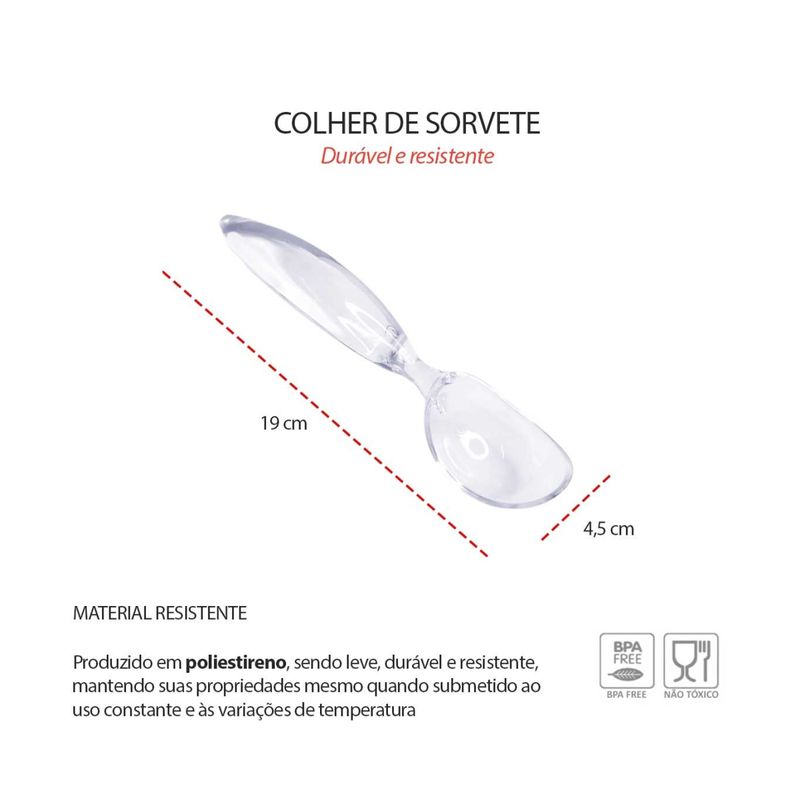 A colher de sorvete com cabo transparente é pratica e funcional, ideal para servir sorvetes com mais conforto e precisao. O formato anatomico facilita a retirada das bolas, enquanto o cabo alongado oferece firmeza e controle durante o uso. Versatil, é indicada para cafeterias, sorveterias ou uso domestico, combinando resistencia, leveza e um visual clean que se adapta facilmente a diferentes ambientes. Contem: 4 Colheres de Sorvete Medidas: 19 x 4,5 x 3,5 cm Material: Poliestireno (PS)