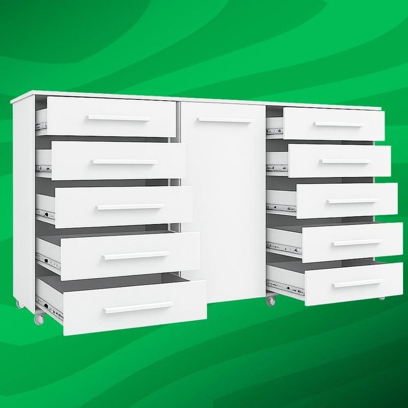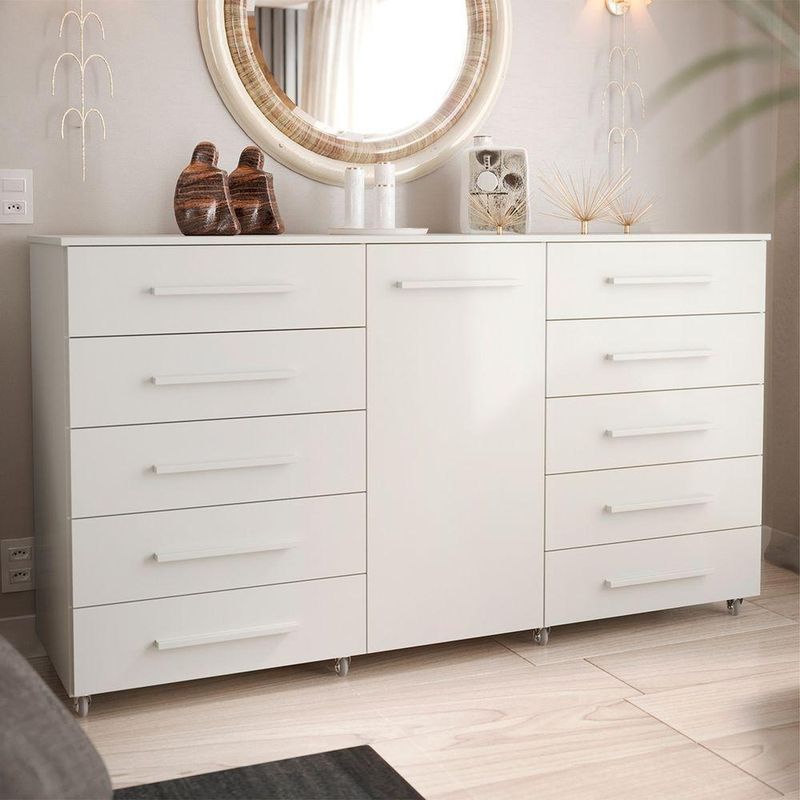 Comoda 1 Porta 10 Gavetas Para Quarto Com Rodizio Imperial Branca - BatrolImponente, espaçosa e extremamente funcional, a Cômoda 1 Porta 10 Gavetas Imperial com Rodízio foi desenvolvida para quem precisa de alta capacidade de armazenamento sem abrir mão da elegância. Seu design marcante aliado à excelente distribuição interna transforma a organização do ambiente em uma experiência prática e eficiente.Com dez gavetas frontais amplas, o modelo permite organizar roupas, acessórios e objetos pessoais de forma estratégica e acessível no dia a dia. A porta lateral complementa o espaço interno, oferecendo compartimento ideal para itens maiores ou volumes que exigem mais discrição.Os rodízios inferiores proporcionam mobilidade suave, facilitando a limpeza e permitindo reposicionar o móvel sempre que necessário. Versátil, adapta-se perfeitamente a quartos, closets ou suítes, agregando funcionalidade e valorizando a decoração do ambiente.Dimensões:Altura: 97cmLargura: 173,5cmProfundidade: 46,8cmObservações:- Perfeita para quartos, closets ou suítes- Rodízios que facilitam a limpeza e reorganização do ambiente- Excelente para quem precisa de grande capacidade de armazenamento- Combina praticidade e estilo em um único móvel- Estrutura com ampla capacidade de armazenamento- Dez gavetas frontais que facilitam a organização de roupas, acessórios e objetos pessoais- Uma porta lateral que amplia os espaços internos para itens maiores- Rodízios com movimentos suaves que permitem deslocar a cômoda com facilidade- Design elegante que valoriza a decoração