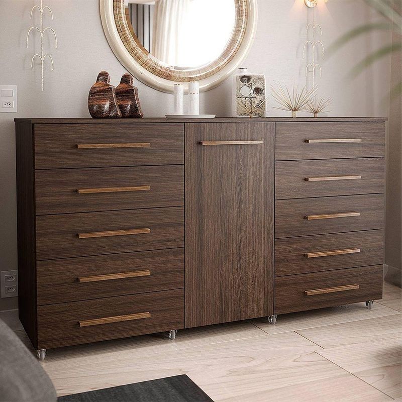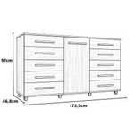 Comoda 1 Porta 10 Gavetas Para Quarto Com Rodizio Imperial Capuccino - BatrolImponente, espaçosa e extremamente funcional, a Cômoda 1 Porta 10 Gavetas Imperial com Rodízio foi desenvolvida para quem precisa de alta capacidade de armazenamento sem abrir mão da elegância. Seu design marcante aliado à excelente distribuição interna transforma a organização do ambiente em uma experiência prática e eficiente.Com dez gavetas frontais amplas, o modelo permite organizar roupas, acessórios e objetos pessoais de forma estratégica e acessível no dia a dia. A porta lateral complementa o espaço interno, oferecendo compartimento ideal para itens maiores ou volumes que exigem mais discrição.Os rodízios inferiores proporcionam mobilidade suave, facilitando a limpeza e permitindo reposicionar o móvel sempre que necessário. Versátil, adapta-se perfeitamente a quartos, closets ou suítes, agregando funcionalidade e valorizando a decoração do ambiente.Dimensões:Altura: 97cmLargura: 173,5cmProfundidade: 46,8cmObservações:- Rodízios que facilitam a limpeza e reorganização do ambiente- Excelente para quem precisa de grande capacidade de armazenamento- Combina praticidade e estilo em um único móvel- Estrutura com ampla capacidade de armazenamento- Dez gavetas frontais que facilitam a organização de roupas, acessórios e objetos pessoais- Uma porta com movimentos suaves que permitem deslocar a cômoda com facilidade- Design elegante que valoriza a decoração