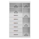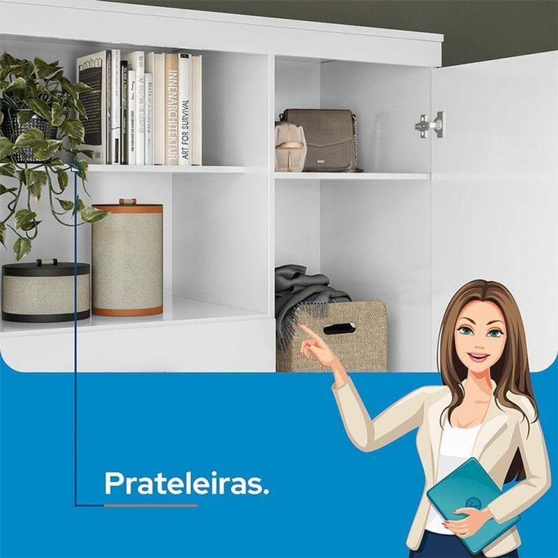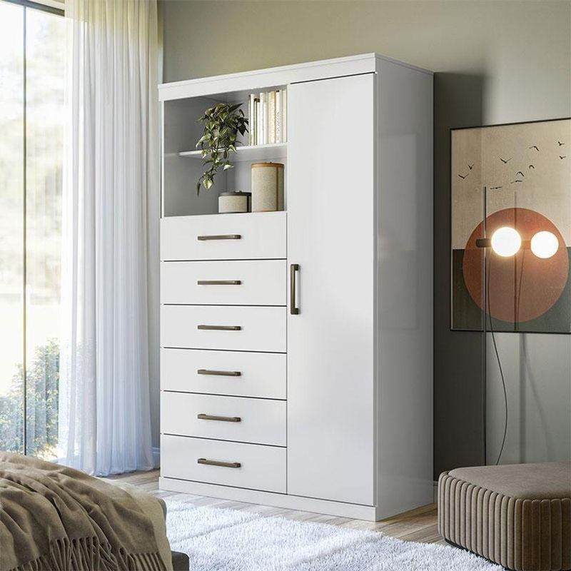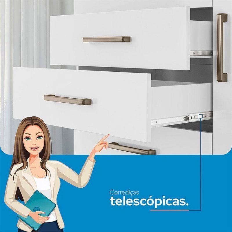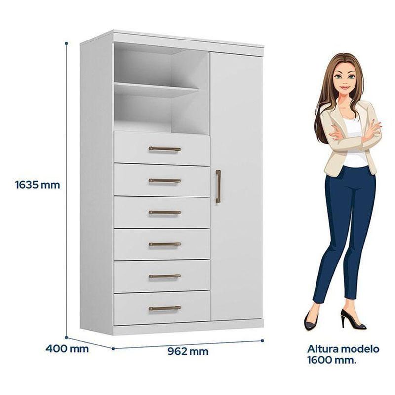Comoda 1 Porta 6 Gavetas Marabá Branco Brilho - Santos AndiráComoda 1 porta 6 gavetas Marabá Branco Brilho - Santos AndiráComoda 1 porta 6 gavetas Marabá Branco: A Multi Cômoda Marabá é um coringa para a casa: pode ficar na cozinha ou quarto e guardar muitos itens graças às seis gavetas, além de suas prateleiras e uma porta com compartimentos.Características técnicas:- Desenvolvido em MDP- Pintura em esmalte- 06 amplas gavetas com corrediças telescópicas- Puxadores em ABS- 01 porta com 03 prateleiras- 01 ampla prateleira externaDimensões:Altura: 163,5 cmLargura: 96,2 cmProfundidade: 40 cmInformações importantes:* Não acompanha decorações e acessórios* Nossas cargas possuem seguro, portanto, no ato da entrega, confira a quantidade de volumes recebida, e também o estado da embalagem. Se houver qualquer inconsistência, não assine o comprovante de entrega;* O armazenamento do produto no endereço de entrega é de responsabilidade do comprador. Evite apoiar o produto na vertical, bem como evite áreas que deixem o produto exposto a chuva ou umidade excessiva;* Pequenas variações de tonalidade são possíveis, em razão da diferença de resolução da tela onde o anúncio está sendo visualizado. Se notar diferença expressiva, comunicar a empresa antes de efetuar a montagem;* O serviço de entrega contratado contempla a entrega até a primeira área coberta ou portaria, não sendo coberto o ato de subir escadas/elevadores ou adentrar nas residências;* Não nos responsabilizamos pela montagem, desmontagem ou instalação do produto. NA