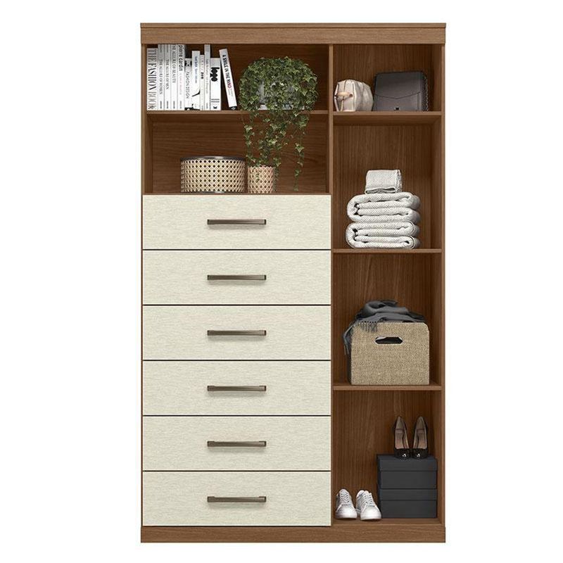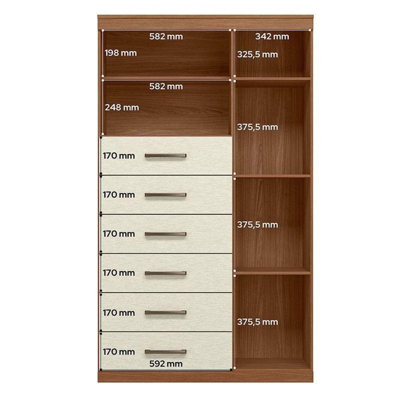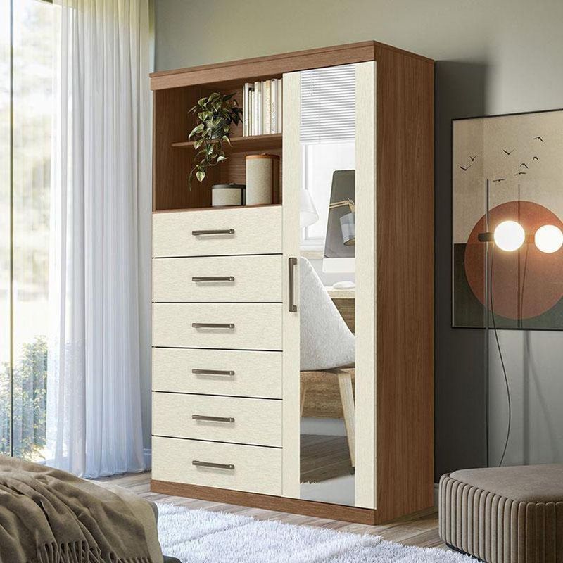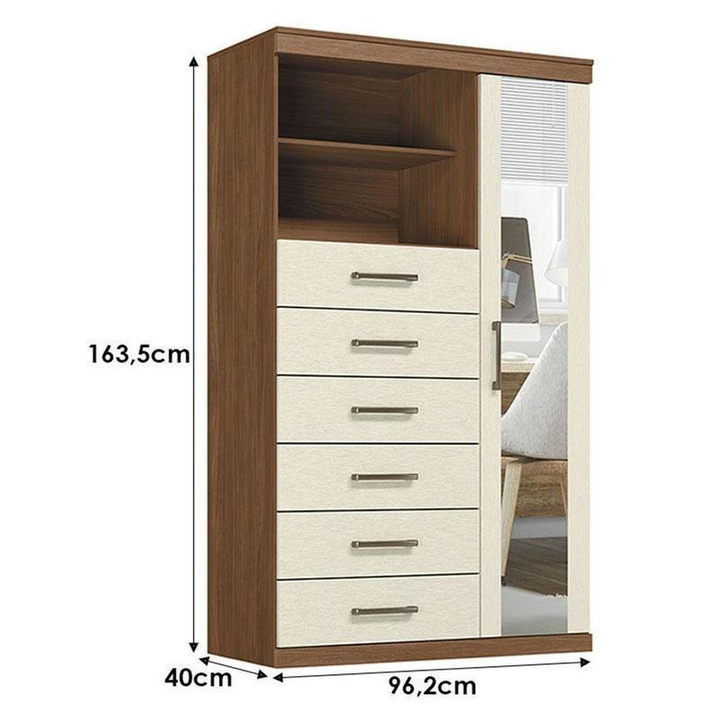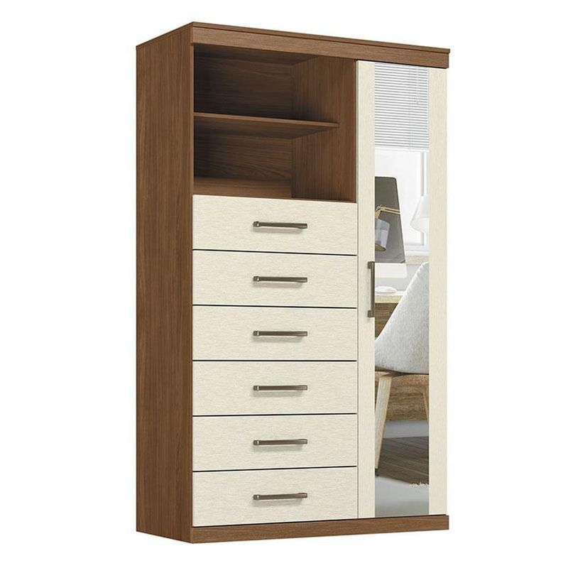 Comoda 1 Porta 6 Gavetas Marabá Com Espelho Jatobá Areia Acetinado - Santos AndiráComoda 1 porta 6 gavetas Marabá com espelho Jatobá Areia Acetinado - Santos AndiráComoda 1 porta 6 gavetas Marabá com espelho Jatobá Areia: A Multi Cômoda Marabá é um coringa para a casa: pode ficar na cozinha ou quarto e guardar muitos itens graças às seis gavetas, além de suas prateleiras e uma porta com compartimentos.Características técnicas:- Desenvolvido em MDP- Pintura em verniz fosco- 06 amplas gavetas com corrediças telescópicas- Puxadores em ABS - 01 porta com 03 prateleiras- 01 ampla prateleira externaDimensões:Altura: 163,5 cmLargura: 96,2 cmProfundidade: 40 cmInformações importantes:* Não acompanha decorações e acessórios* Nossas cargas possuem seguro, portanto, no ato da entrega, confira a quantidade de volumes recebida, e também o estado da embalagem. Se houver qualquer inconsistência, não assine o comprovante de entrega;* O armazenamento do produto no endereço de entrega é de responsabilidade do comprador. Evite apoiar o produto na vertical, bem como evite áreas que deixem o produto exposto a chuva ou umidade excessiva;* Pequenas variações de tonalidade são possíveis, em razão da diferença de resolução da tela onde o anúncio está sendo visualizado. Se notar diferença expressiva, comunicar a empresa antes de efetuar a montagem;* O serviço de entrega contratado contempla a entrega até a primeira área coberta ou portaria, não sendo coberto o ato de subir escadas/elevadores ou adentrar nas residências;* Não nos responsabilizamos pela montagem, desmontagem ou instalação do produto.