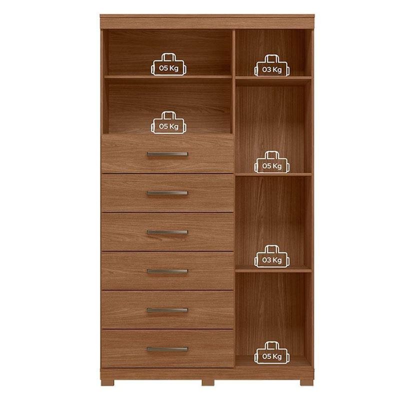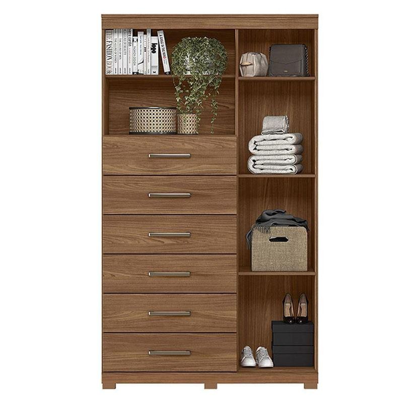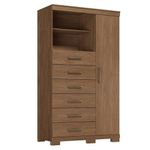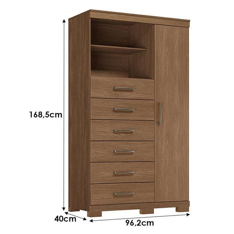 Comoda 1 Porta 6 Gavetas Marabá Com Pés Jatobá Acetinado - Santos AndiráComoda 1 porta 6 gavetas Marabá com pés Jatobá Acetinado - Santos AndiráComoda 1 porta 6 gavetas Marabá com pés Jatobá: A Multi Cômoda Marabá é um coringa para a casa: pode ficar na cozinha ou quarto e guardar muitos itens graças às seis gavetas, além de suas prateleiras e uma porta com compartimentos.Características técnicas:- Desenvolvido em MDP- Pintura em verniz fosco- 06 amplas gavetas com corrediças telescópicas- Puxadores em ABS- 01 porta com 03 prateleiras- 01 ampla prateleira externaDimensões:Altura: 168,5 cmLargura: 96,2 cmProfundidade: 40 cmInformações importantes:* Não acompanha decorações e acessórios* Nossas cargas possuem seguro, portanto, no ato da entrega, confira a quantidade de volumes recebida, e também o estado da embalagem. Se houver qualquer inconsistência, não assine o comprovante de entrega;* O armazenamento do produto no endereço de entrega é de responsabilidade do comprador. Evite apoiar o produto na vertical, bem como evite áreas que deixem o produto exposto a chuva ou umidade excessiva;* Pequenas variações de tonalidade são possíveis, em razão da diferença de resolução da tela onde o anúncio está sendo visualizado. Se notar diferença expressiva, comunicar a empresa antes de efetuar a montagem;* O serviço de entrega contratado contempla a entrega até a primeira área coberta ou portaria, não sendo coberto o ato de subir escadas/elevadores ou adentrar nas residências;* Não nos responsabilizamos pela montagem, desmontagem ou instalação do produto.