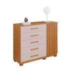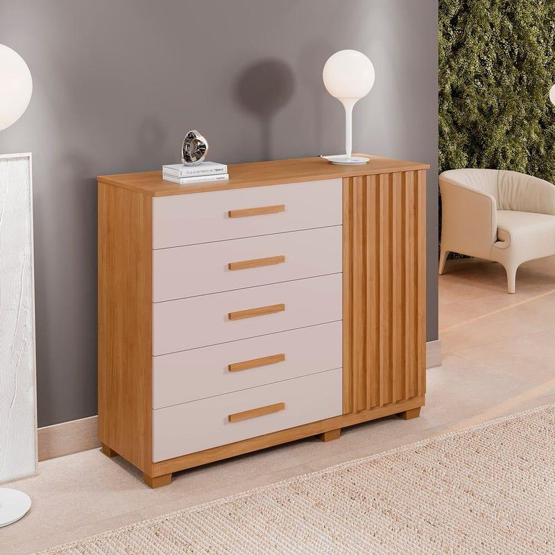 Cômoda 5 Gavetas 1 Porta 122cm Paris - Benetil Cinamomo/off WhiteA Cômoda Paris é um móvel de alta qualidade, produzido em chapa de 15mm que garante robustez e uma vida útil prolongada. Com um design elegante, ela conta com 1 porta ripada, 2 prateleiras espaçosas e 5 gavetas grandes, todas equipadas com corrediças telescópicas para um deslizamento suave. Além disso, os pés estão inclusos no produto, proporcionando estabilidade e segurança. Os puxadores na cor complementam o visual sofisticado do móvel. Com a Cômoda Paris, você tem um excelente custo-benefício, unindo qualidade, funcionalidade e estilo em um só produto.Pesos e DimensõesAltura dos Pés 5 cmAltura (cm) 110,5 cmLargura (cm) 122,5 cmProfundidade (cm) 46,5 cmPeso (kg) 56,6 kgMateriais e AcabamentosMaterial Principal MDPMaterial da Porta MDPAcabamento MelamínicoAcabamento da Gaveta MelamínicoEscala de Brilho FoscoEscala de Brilho da Gaveta FoscoMaterial dos Pés PVCMaterial do Fundo MDPAcabamento da Porta MelamínicoMaterial da Gaveta MDPTipo de Corrediça da Gaveta Metálica TelescópicaEscala de Brilho da Porta FoscoTipo de Dobradiça/Corrediça da Porta MetálicaAcabamento da Prateleira MelamínicoEscala de Brilho da Prateleira FoscoMaterial da Prateleira MDPMontagemNecessita Montagem SimComplexidade da Montagem Média: pode ser montado por mais de uma pessoa e/ou necessite de maior conhecimento para montagemSistema de Montagem PARAFUSOS E CAVILHASRecomendações de Uso, Manutenção e Limpeza Limpeza com pano macio e levemente umedecido. Não utilizar solventes a base e de inflamáveis. Não utilizar produtos abrasivos.CaracterísticasTipo de Cômoda AdultoQuantidade de Prateleiras 02 PrateleirasQuantidade de Gavetas 05 GavetasTipo de Porta BaterMarca Benetil MóveisSuporta Até (kg) 25 kgPossui Rodízio NãoPossui Prateleiras SimPossui Portas SimPossui Pés 06Possui Nichos 03Possui Gavetas SimPeso Máximo por Prateleira 5 kgLinha ou Coleção ParisGaveta com Chave NãoEstilo ModernoSapatas Niveladoras NãoPeso Máximo por Gaveta 3 kgTipo de Puxador da Gaveta ExternoTipo de Puxador da Porta EmbutidoPossui Espelhos NãoOrigem do Produto NacionalAmbiente Principal QuartoItens InclusosItens Inclusos 1 Cômoda, Kit Ferragem e Manual de MontagemObservações:- Todos os produtos têm três (03) meses de garantia fornecida pelo fornecedor- As imagens são meramente ilustrativas, os objetos que ambientam as fotos não acompanham o produto.- Pode haver alguma diferença de tonalidade entre a foto e o produto, devido ao tratamento de imagens e a calibração do monitor- A entrega é realizada por transportadora, não nos responsabilizamos, no ato da entrega por desmontagens, subir escadas/elevadores ou transporte por guincho para apartamentos- Eventuais despesas são de responsabilidade do cliente- Confira as dimensões dos volumes e certifique-se de que passará normalmente por supostos elevadores, portas, escadas ou corredores- Ao receber a mercadoria, verifique as condições da embalagem, caso haja alguma avaria, entre em contato com nosso SAC- Nossa empresa não se responsabiliza pela montagem dos produtos, mas todos os produtos possuem manual de montagem. Recomendamos que a montagem seja feita por profissional de sua confiança.