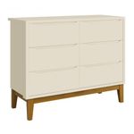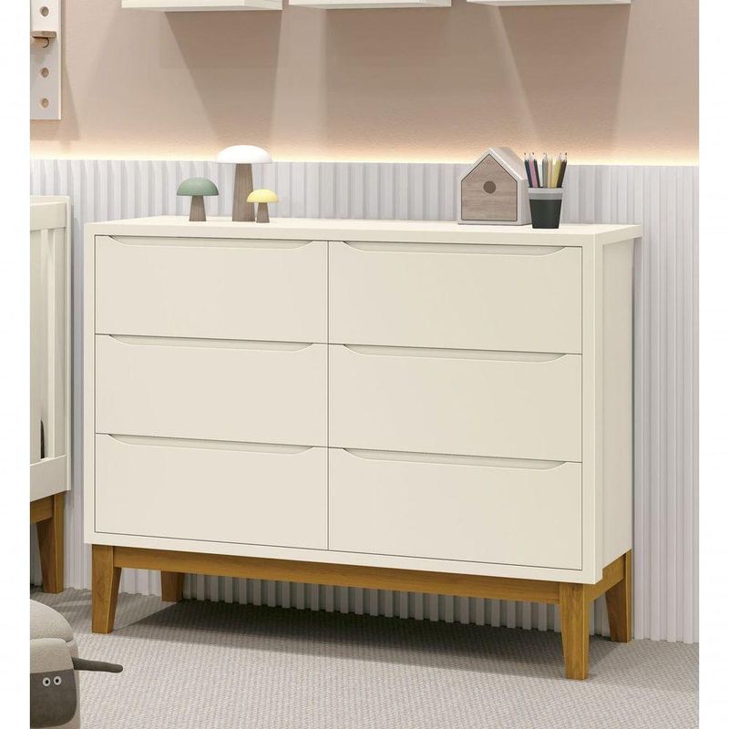 Cômoda 6 Gavetas Classic New Areia Fosco Com Madeira - MoveisaquiA Cômoda 6 gavetas Classic New - MóveisAqui, é perfeita para o quartinho do seu baby, possui pés em madeira maciça que contribuem para o estilo retrô, possui um desing clean que combina com vários estilos de decoração. Contempla amplas seis gavetas, duas contendo divisórias, para uma maravilhosa organização das roupinhas e itens do seu bebê, possibilita um espaço para armazenamento, de modo que a organização do dia-a-dia possa ser mais fácil. Possui puxadores embutidos, onde as aberturas ocorrem através de recortes no MDF que possibilitam o perfeito encaixe da mão para que possa abrir as portas e gavetas.Dimensões do Produto Montado:Altura: 91 cmLargura: 116 cmProfundidade: 45 cmObservações:- 06 gavetas;- Puxadores Embutidos- Corrediças Telescópicas- Sistema Anti Tombamento- 02 gavetas com divisórias- Pés na cor Madeira;- Pintura ultravioleta com acabamento fosco.
