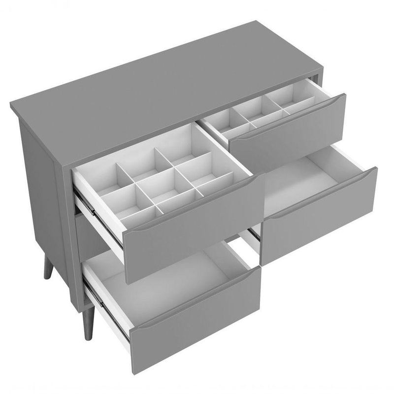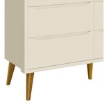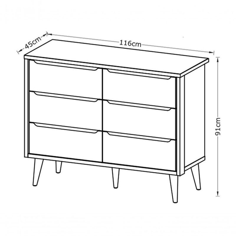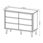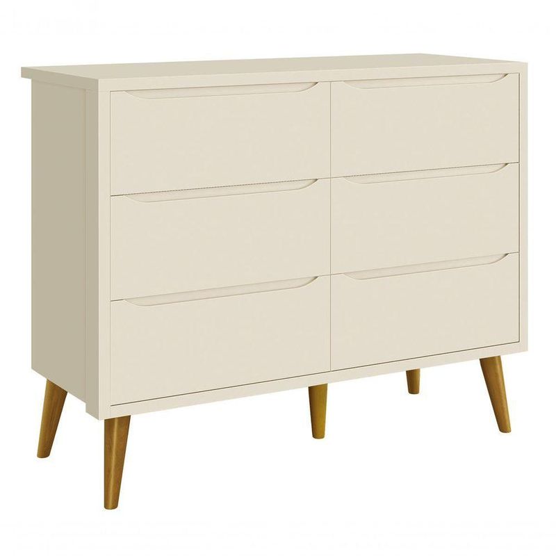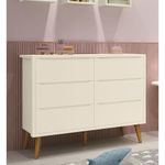 Cômoda 6 Gavetas Théo New Areia Fosco Com Madeira - MoveisaquiA Cômoda 6 gavetas Theo New - MóveisAqui, é essencial para o quartinho do seu baby, possui pés em madeira maciça no estilo palito que contribuem para o estilo retrô, possui um desing clean que combina com vários estilos de decoração. Contempla seis gavetas, duas contendo divisórias, para uma perfeita organização das roupinhas e itens do seu bebê, possibilita um enorme espaço para armazenamento, fazendo com que a organização do dia-a-dia possa ser mais fácil. Possui puxadores embutidos, onde as aberturas ocorrem através de recortes no MDF que possibilitam o perfeito encaixe da mão para que possa abrir as portas e gavetas.Dimensões do Produto Montado:Altura: 91 cmLargura: 116 cmProfundidade: 45 cmObservações:- 06 gavetas;- Puxadores Embutidos- Corrediças Telescópicas- Sistema Anti Tombamento- 02 gavetas com divisórias- Pés na cor Madeira;- Pintura ultravioleta com acabamento fosco.