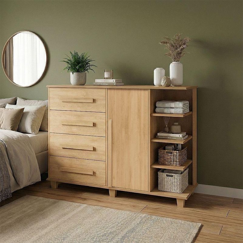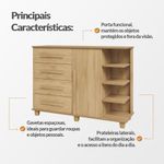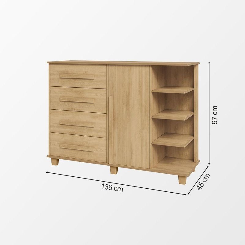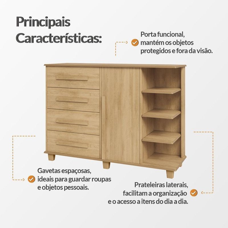 Cômoda Andorra 4 Gavetas 1 Porta C/ Nichos E Prateleiras Organizadora Quarto Infantil - CinamomoA Cômoda Andorra foi desenvolvida para trazer mais praticidade e organização ao ambiente. Seu design combina gavetas amplas, compartimento fechado com porta e nichos laterais com prateleiras, permitindo acomodar roupas, acessórios e diversos itens de forma organizada e acessível. Além de funcional, o móvel também contribui para a organização visual do espaço. As gavetas ajudam a manter objetos protegidos e fora da vista, enquanto os nichos laterais facilitam o acesso a itens utilizados com mais frequência. Uma solução prática e versátil para compor quartos de forma organizada e eficiente.PRINCIPAIS BENEFÍCIOSQuatro gavetas espaçosas ideais para organizar roupas e objetos pessoais.Compartimento com porta que ajuda a manter itens protegidos e fora da vista.Nichos laterais com prateleiras que facilitam o acesso a objetos do dia a dia.Design funcional que contribui para manter o ambiente mais organizado.CARACTERÍSTICAS TÉCNICASTipo: CômodaModelo: AndorraCor: Cinamomo4 gavetas1 portaNichos laterais com prateleirasEstrutura funcional para organização de roupas e objetosIndicado para quartos de bebê / infantilMEDIDAS DO PRODUTOAltura: 97 cmLargura: 136 cmProfundidade: 45 cmCUIDADOS E CONSERVAÇÃOPara manter o produto sempre bonito, recomenda-se a limpeza com pano levemente umedecido, sem uso de produtos abrasivos.ATENÇÃOIMAGENS MERAMENTE ILUSTRATIVAS. AS CORES PODEM VARIAR DE ACORDO COM A TELA, MONITOR, ILUMINAÇÃO DO AMBIENTE OU PERCEPÇÃO VISUAL. ITENS DECORATIVOS PRESENTES NAS IMAGENS NÃO ACOMPANHAM O PRODUTO.Cômoda Andorra 4 Gavetas 1 Porta C/ Nichos e Prateleiras Organizadora Quarto Infantil - Cinamomo