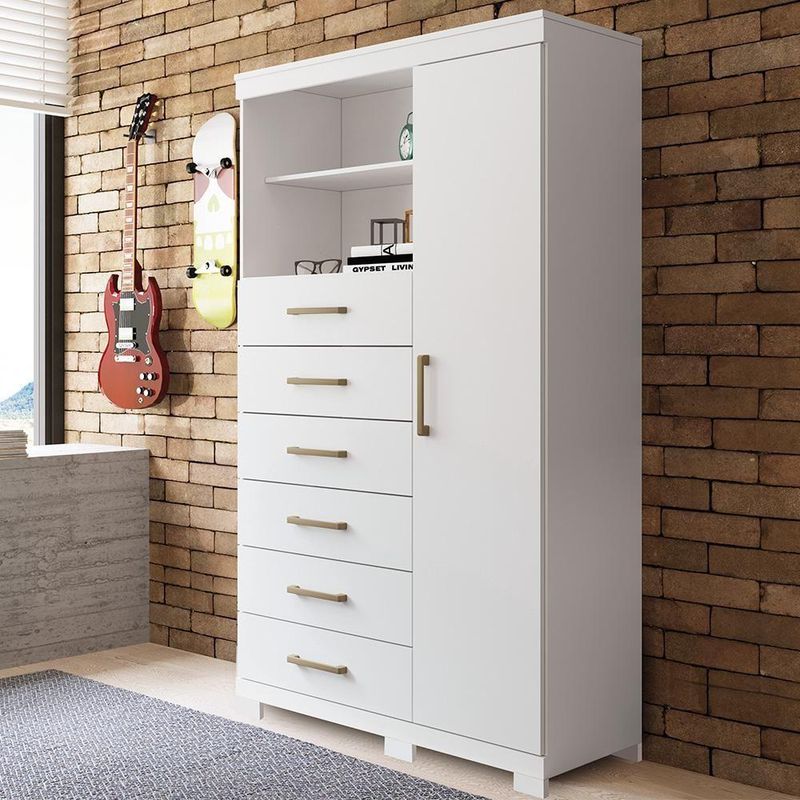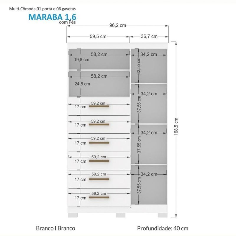 Cômoda De Madeira 6 Gavetas 1 Porta Marabá Santos Andirá BrancoA Santos Andirá apresenta a Multi Cômoda Marabá, um móvel incrível que pode ser utilizado em vários ambientes da sua casa: na cozinha, na garagem, no quarto, na lavandeira. Sua versatilidade permite que você guarde diversos objetos e utensílios. E por falar em organização, ele conta com 06 amplas gavetas com corrediças metálicas, 2 prateleiras externas e uma porta com 3 prateleiras internas. É muito espaço para guardar tudo que precisa. Os pés facilitam a limpeza embaixo do móvel. NA