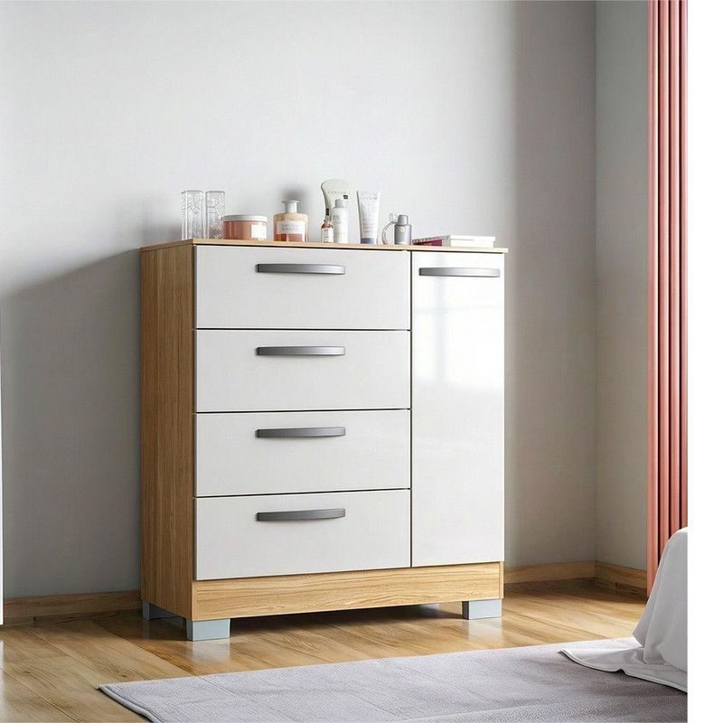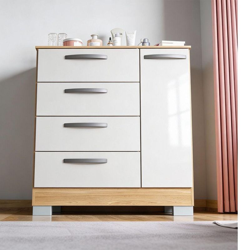 Cômoda Elena Poquema Com 1 Porta E 4 Gavetas Damasco/off WhiteA Comoda Elena Poquema e uma solucao pratica e funcional para manter o ambiente organizado com um visual clean e moderno. Seu design versatil na cor branca se adapta facilmente a diferentes estilos de decoracao, trazendo leveza ao espaco e facilitando a harmonizacao com outros moveis. Com boa capacidade interna e estrutura pensada para o uso diario, e ideal para quartos, closets e ambientes residenciais que exigem organizacao eficiente e aproveitamento inteligente do espaco.Caracteristicas Produto: Comoda Modelo: Elena Marca: Poquema Quantidade de portas: 01 Quantidade de gavetas: 04 Material: MDP 12 mm Cor: Branca Dobradicas: Metalicas Corredicas: Metalicas Puxadores: Plastico Pes: Plastico na cor cinza Acabamento: Pintura U.V. Uso indicado: Quarto, closet e ambientes residenciais Necessita montagem: Sim Dimensoes Altura: 95 cm Largura: 86 cm Profundidade: 40 cm Conteudo da embalagem 01 Comoda Elena Poquema com 1 Porta e 4 Gavetas Garantia 3 Meses