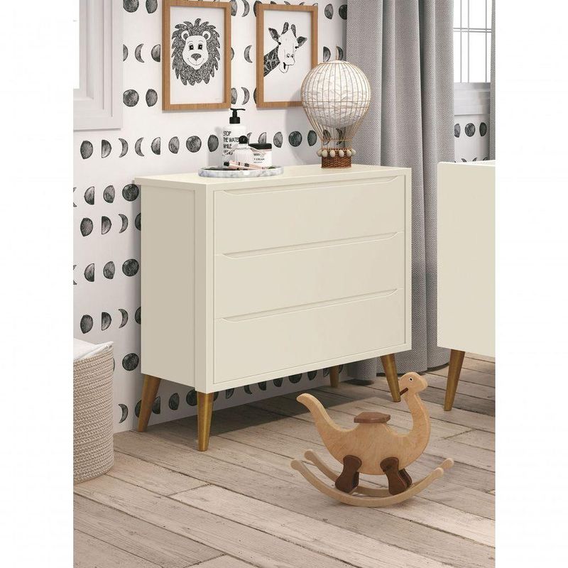 Cômoda Gaveteiro Théo New Areia Fosco Com Madeira - RellerA Cômoda GaveteiroTheo New - RELLER, apresenta um ar retrô com seus pés em madeira maciça no estilo palito, possui um desing clean que combina com vários estilos de decoração. É perfeita para a organização das roupinhas e itens do seu bebê, possibilita um super espaço para armazenamento com suas três gavetas, de modo que a organização do dia-a-dia possa ser mais fácil. Possui puxadores embutidos, onde as aberturas ocorrem através de recortes no MDF que possibilitam o perfeito encaixe da mão para que possa abrir as portas e gavetas.Dimensões do Produto Montado:Altura: 91 cmLargura: 91 cmProfundidade: 46 cmObservações:- 03 gavetas;- Produzida em MDF;- Corrediças Telescópicas;- Puxadores embutido;- Pés na cor Madeira;- Pintura ultravioleta com acabamento fosco.