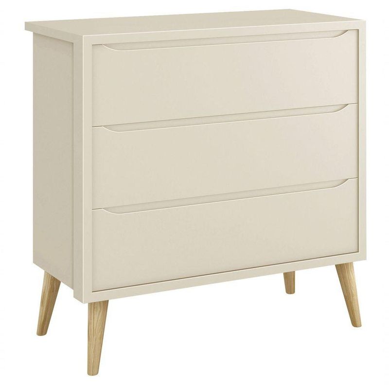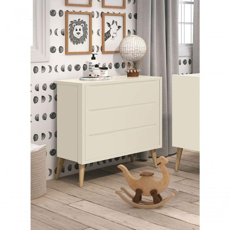 Cômoda Gaveteiro Théo New Areia Fosco Com Natural - RellerA Cômoda GaveteiroTheo New - RELLER, apresenta um ar retrô com seus pés em madeira maciça no estilo palito, possui um desing clean que combina com vários estilos de decoração. É perfeita para a organização das roupinhas e itens do seu bebê, possibilita um super espaço para armazenamento com suas três gavetas, de modo que a organização do dia-a-dia possa ser mais fácil. Possui puxadores embutidos, onde as aberturas ocorrem através de recortes no MDF que possibilitam o perfeito encaixe da mão para que possa abrir as portas e gavetas.Dimensões do Produto Montado:Altura: 91 cmLargura: 91 cmProfundidade: 46 cmObservações:- 03 gavetas;- Produzida em MDF;- Corrediças Telescópicas;- Puxadores embutido;- Pés na cor Natural;- Pintura ultravioleta com acabamento fosco.