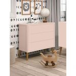 Cômoda Gaveteiro Théo New Rosa Fosco Com Madeira - MoveisaquiA Cômoda GaveteiroTheo New - MóveisAqui, apresenta um ar retrô com seus pés em madeira maciça no estilo palito, possui um desing clean que combina com vários estilos de decoração. É perfeita para a organização das roupinhas e itens do seu bebê, possibilita um super espaço para armazenamento com suas três gavetas, de modo que a organização do dia-a-dia possa ser mais fácil. Possui puxadores embutidos, onde as aberturas ocorrem através de recortes no MDF que possibilitam o perfeito encaixe da mão para que possa abrir as portas e gavetas.Dimensões do Produto Montado:Altura: 91 cmLargura: 91 cmProfundidade: 46 cmObservações:- 03 gavetas;- Produzida em MDF;- Corrediças Telescópicas;- Puxadores embutido;- Pés na cor Madeira;- Pintura ultravioleta com acabamento fosco.