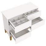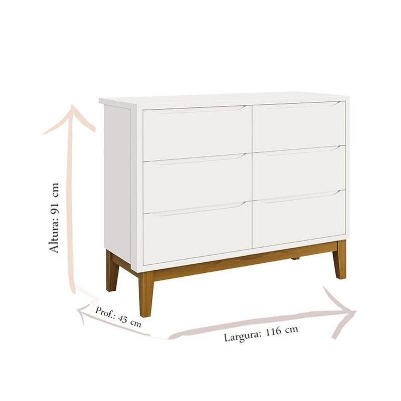 Cômoda Infantil 6 Gavetas Classic Branco Acetinado Com Pés Madeira - RellerCômoda Infantil 6 Gavetas Classic Branco Acetinado com Pés Madeira – RellerMamãe sabe aquela cômoda nem tão grandona nem tão pequena que sonhamos e buscamos tanto para decorar o quartinho do bebê? Agora nós a temos, a cômoda perfeita não só em design e praticidade como também em sua matéria prima de alta qualidade, desenvolvida pela Reller a Cômoda 6 Gavetas Classic vai ganhar o seu coração, confira as características e aproveite!Características Técnicas: - Desenvolvido em MDF - Puxadores embutidos - Corrediças telescópicas - Sistema antitombamento - 06 gavetas sendo 02 com divisórias - Pés em madeira pinus - Pintura e acabamento UV - Sistema de pintura atóxica, que não faz mal a saúde do bebê - Lindo DesignDimensões: Altura: 91 cm Largura: 116 cm Profundidade: 45 cm OBS: Não realizamos a montagem, porém acompanha manual de instruções.