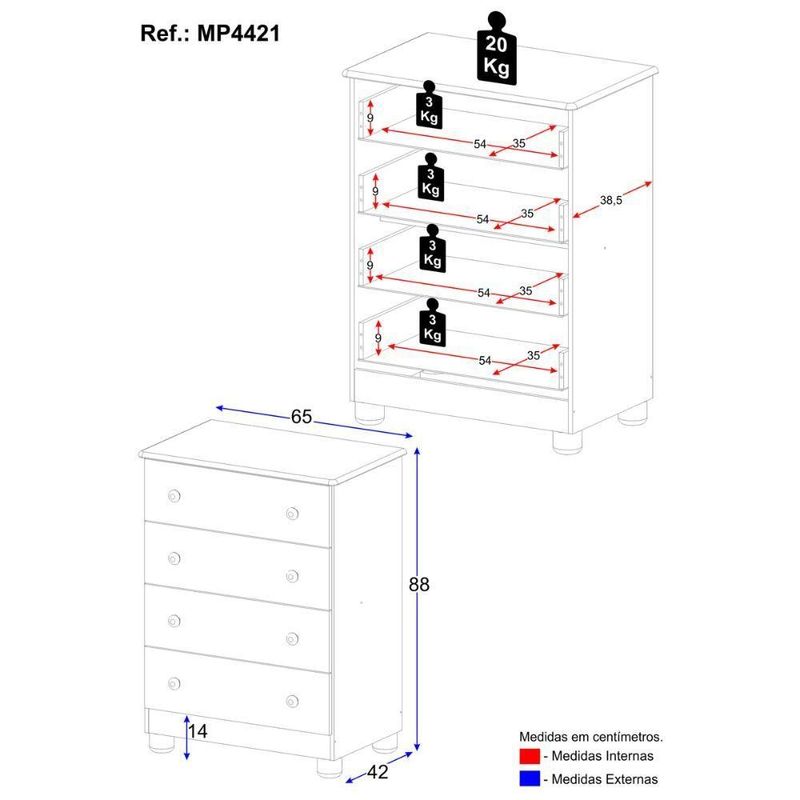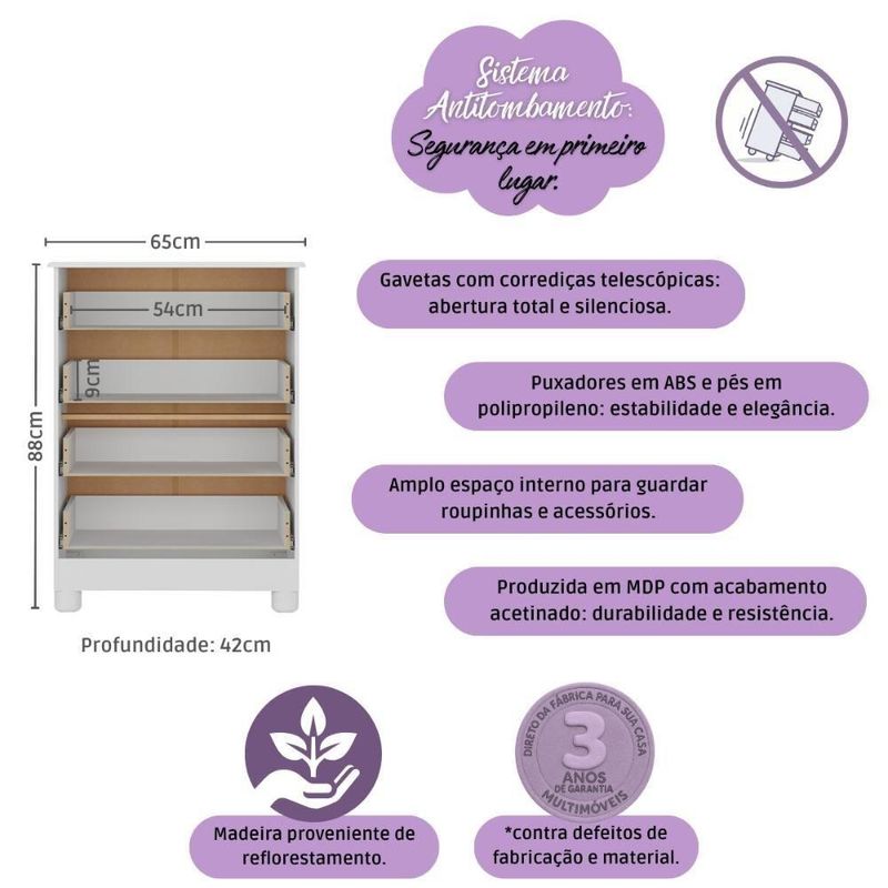 Cômoda Infantil 65cm Com 4 Gavetas Allegra Multimóveis Mp4421 Branco/off White Branco/off WhiteCriada para acompanhar a doçura da infância, a Cômoda Infantil 65cm com 4 Gavetas Allegra Multimóveis MP4421 traz o equilíbrio perfeito entre estilo e utilidade. Suas gavetas espaçosas ajudam a manter o quarto sempre em ordem, enquanto o visual delicado transforma o ambiente em um espaço ainda mais acolhedor. Um móvel que cuida, decora e facilita.Diferenciais:- 3 anos de garantia contra defeitos de fabricação e material.- Produzida em madeira de reflorestamento (MDP 12/15mm) com acabamento acetinado (cerca de 20% de brilho): sustentabilidade e durabilidade.- 4 gavetas: amplo espaço interno para organizar roupinhas e acessórios.- Corrediças telescópicas: permitem a abertura total e o manuseio silencioso das gavetas.- Puxadores em ABS redondos e práticos.- Pés em polipropileno e rodapé: estabilidade e elegância.- Sistema antitombamento: proporciona segurança para o bebê e tranquilidade aos pais.Conteúdo da Embalagem:1 (uma) CômodaManual de MontagemKit FerragemDimensões do Produto Montado:Altura: 88cm | Largura: 65cm | Profundidade: 42cmAltura dos Pés: 5,8cm*Você pode consultar as medidas detalhadas na imagem técnica do produto.Observações Importantes:*As cores do produto podem sofrer variações de tonalidade de acordo com as configurações do seu dispositivo.*Aqui na Loja Multimóveis, você pode concluir sua compra facilmente com toda segurança. A entrega é garantida e você está em 1° lugar.*Imagens meramente ilustrativas (decoração não inclusa).*O produto será entregue desmontado e não disponibilizamos o serviço de montagem. Acabamento: FF/Pintura UV | Material: MDP | Referência do Modelo: MP4421 | Coleção: | Instruções de Cuidado: Limpar com pano seco para retirar o pó. Não utilizar produtos químicos ou abrasivos a limpeza. Não aplicar lustra móveis. | Sistema de Montagem: O produto acompanha manual de montagem juntamente com kit ferragem. O produto será entregue desmontado e não disponibilizamos o serviço de montagem. | Produto Composto por: 1 cômoda, manual de montagem e kit ferragem. | Com Gaveteiro: Sim | Corrediça: Telescópica | Material do Puxador: ABS | Quantidade de Gavetas: 4 | Quantidade de Portas: 0 | Quantidade de Prateleiras: 0 | Altura Montado: 88 | Largura Montado: 65 | Profundidade Montado: 42 | Tamanho (L x A x P): 65 x 88 x 42 | Tonalidade: Branco | Peso do Produto: 25 | Garantia do Fabricante: 3 | É Desmontável: Não | Fabricante: Multimóveis | Produto: Cômoda | Altura (cm): 88 cm | Largura (cm): 65 cm | Profundidade (cm): 42 cm | Tempo de Garantia: 3 meses | Tipo de móvel: Cômoda | Material das gavetas: MDP | Com corrediças: Sim | Com portas: Não | Material de dobradiças: N/A | Com prateleiras: Não | Com prateleiras ajustáveis: Não | Requer Montagem: Sim | Inclui manual de montagem: Sim | Inclui acessórios de montagem: Sim | Peso (kg): 25 kg | Material do corpo: MDP | Estilo: Moderno | Marca: Multimóveis | Quantidade de caixas de embalagem: 02 | Destaque 1: Produzida em MDP: maior durabilidade e resistência. | Destaque 2: Gavetas com corrediças telescópicas: abertura total e silenciosa. | Destaque 3: Puxadores redondos em ABS: práticos e delicados. | Destaque 4: Pés em polipropileno e rodapés: estabilidade e elegância. | Destaque 5: Tamanho do produto montado (L x A x P): 65 x 88 x 42 cm | Baterias são necessárias?: Não | Certificação de teste externa: N/A | Dimensões do item P x L x A: depth#value=42;depth#unit=centimeters;width#value=65;width#unit=centimeters;height#value=88;height#unit=centimeters | Is Fragile: Não | Peso do item: unit=kilograms;value=25 | Quantidade de itens: 1 | Número da peça: MP4421.697 | É resistente à umidade: Não | Com alças: Sim | Com pés: Sim | Com rodas: Não | Tipo de Garantia: Garantia do Fabricante | Montagem: Necessita Montagem | País de Origem: Brasil | Altura do Produto com Embalagem: 20 cm | Largura do Produto com Embalagem: 46 cm | Comprimento do Produto com Embalagem: 86 cm | Tipo da embalagem do vendor: Sem embalagem adicional | Peso do Produto com Embalagem: 25000 g | Cor: Branco/Off White
