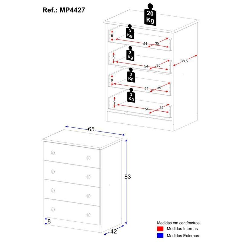 Cômoda Infantil 65cm Com 4 Gavetas Encanto Multimóveis Mp4427 Branco/off White Branco/off WhiteCriada para acompanhar a doçura da infância, a Cômoda Infantil 65cm com 4 Gavetas Encanto Multimóveis MP4427 traz o equilíbrio perfeito entre estilo e utilidade. Suas gavetas espaçosas ajudam a manter o quarto sempre em ordem, enquanto o visual delicado transforma o ambiente em um espaço ainda mais acolhedor. Um móvel que cuida, decora e facilita.Diferenciais:- 3 anos de garantia contra defeitos de fabricação e material.- Produzida em madeira de reflorestamento (MDP 12/15mm) com acabamento acetinado (cerca de 20% de brilho): sustentabilidade e durabilidade.- 4 gavetas: amplo espaço interno para organizar roupinhas e acessórios.- Corrediças telescópicas: permitem a abertura total e o manuseio silencioso das gavetas.- Puxadores em ABS redondos e práticos.- Rodapé: visual harmonioso e facilidade na limpeza do ambiente.- Sistema antitombamento: proporciona segurança para o bebê e tranquilidade aos pais.Conteúdo da Embalagem:1 (uma) CômodaManual de MontagemKit FerragemDimensões do Produto Montado:Altura: 83cm | Largura: 65cm | Profundidade: 42cm*Você pode consultar as medidas detalhadas na imagem técnica do produto.Observações Importantes:*As cores do produto podem sofrer variações de tonalidade de acordo com as configurações do seu dispositivo.*Aqui na Loja Multimóveis, você pode concluir sua compra facilmente com toda segurança. A entrega é garantida e você está em 1° lugar.*Imagens meramente ilustrativas (decoração não inclusa).*O produto será entregue desmontado e não disponibilizamos o serviço de montagem. Acabamento: FF/Pintura UV | Material: MDP | Referência do Modelo: MP4427 | Coleção: | Instruções de Cuidado: Limpar com pano seco para retirar o pó. Não utilizar produtos químicos ou abrasivos a limpeza. Não aplicar lustra móveis. | Sistema de Montagem: O produto acompanha manual de montagem juntamente com kit ferragem. O produto será entregue desmontado e não disponibilizamos o serviço de montagem. | Produto Composto por: 1 cômoda, manual de montagem e kit ferragem. | Com Gaveteiro: Sim | Corrediça: Telescópica | Material do Puxador: ABS | Quantidade de Gavetas: 4 | Quantidade de Portas: 0 | Quantidade de Prateleiras: 0 | Altura Montado: 83 | Largura Montado: 65 | Profundidade Montado: 42 | Tamanho (L x A x P): 65 x 83 x 42 | Tonalidade: Branco | Peso do Produto: 25 | Garantia do Fabricante: 3 | É Desmontável: Não | Fabricante: Multimóveis | Produto: Cômoda | Altura (cm): 83 cm | Largura (cm): 65 cm | Profundidade (cm): 42 cm | Tempo de Garantia: 3 meses | Tipo de móvel: Cômoda | Material das gavetas: MDP | Com corrediças: Sim | Com portas: Não | Material de dobradiças: N/A | Com prateleiras: Não | Com prateleiras ajustáveis: Não | Requer Montagem: Sim | Inclui manual de montagem: Sim | Inclui acessórios de montagem: Sim | Peso (kg): 25 kg | Material do corpo: MDP | Estilo: Moderno | Marca: Multimóveis | Quantidade de caixas de embalagem: 02 | Destaque 1: Produzida em MDP: maior durabilidade e resistência. | Destaque 2: Gavetas com corrediças telescópicas: abertura total e silenciosa. | Destaque 3: Puxadores redondos em ABS: práticos e delicados. | Destaque 4: Rodapé: visual elegante e harmonioso. | Destaque 5: Tamanho do produto montado (L x A x P): 65 x 83 x 42 cm | Baterias são necessárias?: Não | Certificação de teste externa: N/A | Dimensões do item P x L x A: depth#value=42;depth#unit=centimeters;width#value=65;width#unit=centimeters;height#value=83;height#unit=centimeters | Is Fragile: Não | Peso do item: unit=kilograms;value=25 | Quantidade de itens: 1 | Número da peça: MP4427.697 | É resistente à umidade: Não | Com alças: Sim | Com pés: Não | Com rodas: Não | Tipo de Garantia: Garantia do Fabricante | Montagem: Necessita Montagem | País de Origem: Brasil | Altura do Produto com Embalagem: 20 cm | Largura do Produto com Embalagem: 46 cm | Comprimento do Produto com Embalagem: 86 cm | Tipo da embalagem do vendor: Sem embalagem adicional | Peso do Produto com Embalagem: 25000 g | Cor: Branco/Off White