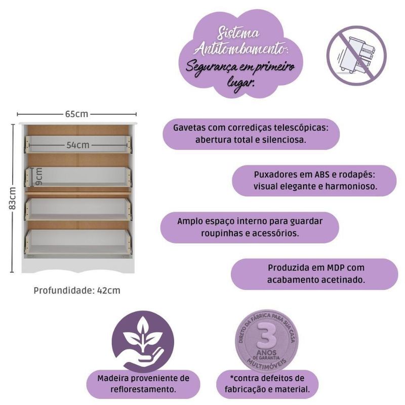 Cômoda Infantil 65cm Com 4 Gavetas Realeza Multimóveis Mp4433 Branco/madeirado Branco/madeiradoCriada para acompanhar a doçura da infância, a Cômoda Infantil 65cm com 4 Gavetas Realeza Multimóveis MP4433 traz o equilíbrio perfeito entre estilo e utilidade. Suas gavetas espaçosas ajudam a manter o quarto sempre em ordem, enquanto o visual delicado transforma o ambiente em um espaço ainda mais acolhedor. Um móvel que cuida, decora e facilita.Diferenciais:- 3 anos de garantia contra defeitos de fabricação e material.- Produzida em madeira de reflorestamento (MDP 12/15mm) com acabamento acetinado (cerca de 20% de brilho): sustentabilidade e durabilidade.- 4 gavetas: amplo espaço interno para organizar roupinhas e acessórios.- Corrediças telescópicas: permitem a abertura total e o manuseio silencioso das gavetas.- Puxadores em ABS redondos e práticos.- Rodapé usinado: visual harmonioso e elegante.- Sistema antitombamento: proporciona segurança para o bebê e tranquilidade aos pais.Conteúdo da Embalagem:1 (uma) CômodaManual de MontagemKit FerragemDimensões do Produto Montado:Altura: 83cm | Largura: 65cm | Profundidade: 42cm*Você pode consultar as medidas detalhadas na imagem técnica do produto.Observações Importantes:*As cores do produto podem sofrer variações de tonalidade de acordo com as configurações do seu dispositivo.*Aqui na Loja Multimóveis, você pode concluir sua compra facilmente com toda segurança. A entrega é garantida e você está em 1° lugar.*Imagens meramente ilustrativas (decoração não inclusa).*O produto será entregue desmontado e não disponibilizamos o serviço de montagem. Acabamento: FF/Pintura UV | Material: MDP | Referência do Modelo: MP4433 | Coleção: | Instruções de Cuidado: Limpar com pano seco para retirar o pó. Não utilizar produtos químicos ou abrasivos a limpeza. Não aplicar lustra móveis. | Sistema de Montagem: O produto acompanha manual de montagem juntamente com kit ferragem. O produto será entregue desmontado e não disponibilizamos o serviço de montagem. | Produto Composto por: 1 cômoda, manual de montagem e kit ferragem. | Com Gaveteiro: Sim | Corrediça: Telescópica | Material do Puxador: ABS | Quantidade de Gavetas: 4 | Quantidade de Portas: 0 | Quantidade de Prateleiras: 0 | Altura Montado: 83 | Largura Montado: 65 | Profundidade Montado: 42 | Tamanho (L x A x P): 65 x 83 x 42 | Tonalidade: Branco | Peso do Produto: 25 | Garantia do Fabricante: 3 | É Desmontável: Não | Fabricante: Multimóveis | Produto: Cômoda | Altura (cm): 83 cm | Largura (cm): 65 cm | Profundidade (cm): 42 cm | Tempo de Garantia: 3 meses | Tipo de móvel: Cômoda | Material das gavetas: MDP | Com corrediças: Sim | Com portas: Não | Material de dobradiças: N/A | Com prateleiras: Não | Com prateleiras ajustáveis: Não | Requer Montagem: Sim | Inclui manual de montagem: Sim | Inclui acessórios de montagem: Sim | Peso (kg): 25 kg | Material do corpo: MDP | Estilo: Moderno | Marca: Multimóveis | Quantidade de caixas de embalagem: 02 | Destaque 1: Produzida em MDP: maior durabilidade e resistência. | Destaque 2: Gavetas com corrediças telescópicas: abertura total e silenciosa. | Destaque 3: Puxadores redondos em ABS: práticos e delicados. | Destaque 4: Rodapé: visual elegante e harmonioso. | Destaque 5: Tamanho do produto montado (L x A x P): 65 x 83 x 42 cm | Baterias são necessárias?: Não | Certificação de teste externa: N/A | Dimensões do item P x L x A: depth#value=42;depth#unit=centimeters;width#value=65;width#unit=centimeters;height#value=83;height#unit=centimeters | Is Fragile: Não | Peso do item: unit=kilograms;value=25 | Quantidade de itens: 1 | Número da peça: MP4433.697 | É resistente à umidade: Não | Com alças: Sim | Com pés: Não | Com rodas: Não | Tipo de Garantia: Garantia do Fabricante | Montagem: Necessita Montagem | País de Origem: Brasil | Altura do Produto com Embalagem: 20 cm | Largura do Produto com Embalagem: 46 cm | Comprimento do Produto com Embalagem: 86 cm | Tipo da embalagem do vendor: Sem embalagem adicional | Peso do Produto com Embalagem: 25000 g | Cor: Branco/Madeirado