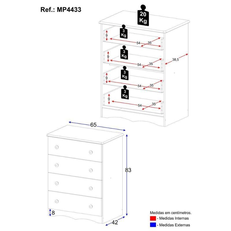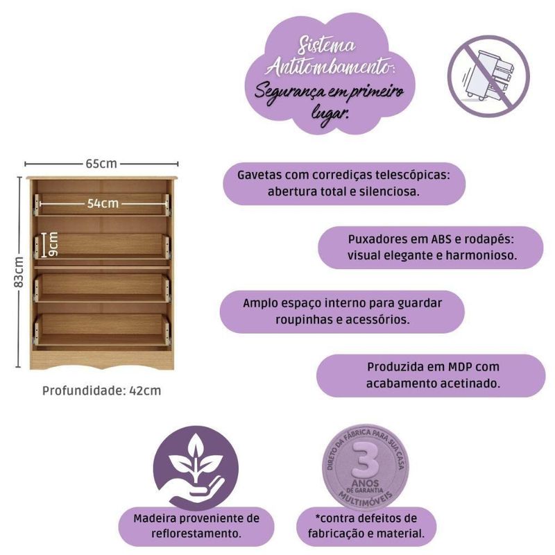 Cômoda Infantil 65cm Com 4 Gavetas Realeza Multimóveis Mp4433 Madeirado MadeiradoCriada para acompanhar a doçura da infância, a Cômoda Infantil 65cm com 4 Gavetas Realeza Multimóveis MP4433 traz o equilíbrio perfeito entre estilo e utilidade. Suas gavetas espaçosas ajudam a manter o quarto sempre em ordem, enquanto o visual delicado transforma o ambiente em um espaço ainda mais acolhedor. Um móvel que cuida, decora e facilita.Diferenciais:- 3 anos de garantia contra defeitos de fabricação e material.- Produzida em madeira de reflorestamento (MDP 12/15mm) com acabamento acetinado (cerca de 20% de brilho): sustentabilidade e durabilidade.- 4 gavetas: amplo espaço interno para organizar roupinhas e acessórios.- Corrediças telescópicas: permitem a abertura total e o manuseio silencioso das gavetas.- Puxadores em ABS redondos e práticos.- Rodapé usinado: visual harmonioso e elegante.- Sistema antitombamento: proporciona segurança para o bebê e tranquilidade aos pais.Conteúdo da Embalagem:1 (uma) CômodaManual de MontagemKit FerragemDimensões do Produto Montado:Altura: 83cm | Largura: 65cm | Profundidade: 42cm*Você pode consultar as medidas detalhadas na imagem técnica do produto.Observações Importantes:*As cores do produto podem sofrer variações de tonalidade de acordo com as configurações do seu dispositivo.*Aqui na Loja Multimóveis, você pode concluir sua compra facilmente com toda segurança. A entrega é garantida e você está em 1° lugar.*Imagens meramente ilustrativas (decoração não inclusa).*O produto será entregue desmontado e não disponibilizamos o serviço de montagem. Acabamento: FF/Pintura UV | Material: MDP | Referência do Modelo: MP4433 | Coleção: | Instruções de Cuidado: Limpar com pano seco para retirar o pó. Não utilizar produtos químicos ou abrasivos a limpeza. Não aplicar lustra móveis. | Sistema de Montagem: O produto acompanha manual de montagem juntamente com kit ferragem. O produto será entregue desmontado e não disponibilizamos o serviço de montagem. | Produto Composto por: 1 cômoda, manual de montagem e kit ferragem. | Com Gaveteiro: Sim | Corrediça: Telescópica | Material do Puxador: ABS | Quantidade de Gavetas: 4 | Quantidade de Portas: 0 | Quantidade de Prateleiras: 0 | Altura Montado: 83 | Largura Montado: 65 | Profundidade Montado: 42 | Tamanho (L x A x P): 65 x 83 x 42 | Tonalidade: Branco | Peso do Produto: 25 | Garantia do Fabricante: 3 | É Desmontável: Não | Fabricante: Multimóveis | Produto: Cômoda | Altura (cm): 83 cm | Largura (cm): 65 cm | Profundidade (cm): 42 cm | Tempo de Garantia: 3 meses | Tipo de móvel: Cômoda | Material das gavetas: MDP | Com corrediças: Sim | Com portas: Não | Material de dobradiças: N/A | Com prateleiras: Não | Com prateleiras ajustáveis: Não | Requer Montagem: Sim | Inclui manual de montagem: Sim | Inclui acessórios de montagem: Sim | Peso (kg): 25 kg | Material do corpo: MDP | Estilo: Moderno | Marca: Multimóveis | Quantidade de caixas de embalagem: 02 | Destaque 1: Produzida em MDP: maior durabilidade e resistência. | Destaque 2: Gavetas com corrediças telescópicas: abertura total e silenciosa. | Destaque 3: Puxadores redondos em ABS: práticos e delicados. | Destaque 4: Rodapé: visual elegante e harmonioso. | Destaque 5: Tamanho do produto montado (L x A x P): 65 x 83 x 42 cm | Baterias são necessárias?: Não | Certificação de teste externa: N/A | Dimensões do item P x L x A: depth#value=42;depth#unit=centimeters;width#value=65;width#unit=centimeters;height#value=83;height#unit=centimeters | Is Fragile: Não | Peso do item: unit=kilograms;value=25 | Quantidade de itens: 1 | Número da peça: MP4433.697 | É resistente à umidade: Não | Com alças: Sim | Com pés: Não | Com rodas: Não | Tipo de Garantia: Garantia do Fabricante | Montagem: Necessita Montagem | País de Origem: Brasil | Altura do Produto com Embalagem: 20 cm | Largura do Produto com Embalagem: 46 cm | Comprimento do Produto com Embalagem: 86 cm | Tipo da embalagem do vendor: Sem embalagem adicional | Peso do Produto com Embalagem: 25000 g | Cor: Madeirado