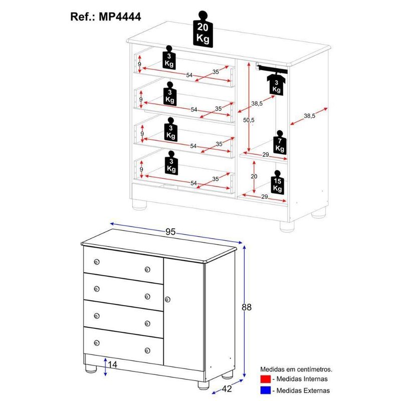 Cômoda Infantil 95cm 1 Porta E 4 Gavetas Allegra Multimóveis Mp4444 Branco/madeirado Branco/madeiradoA Cômoda Infantil 95cm 1 Porta e 4 Gavetas Allegra Multimóveis MP4444 foi criada para trazer mais leveza à rotina do bebê, oferecendo um cantinho organizado, delicado e cheio de aconchego. Cada detalhe foi pensado para facilitar o dia a dia dos pais e deixar o quarto ainda mais encantador. Um móvel que combina praticidade e carinho em cada gaveta.Diferenciais:- 3 anos de garantia contra defeitos de fabricação e material.- Produzida em madeira de reflorestamento (MDP 12/15mm) com acabamento acetinado (cerca de 20% de brilho): sustentabilidade e durabilidade.- 1 porta e 4 gavetas: amplo espaço interno para organizar roupinhas e acessórios.- Corrediças telescópicas: permitem a abertura total e o manuseio silencioso das gavetas.- Cabideiro em alumínio: acomoda as roupas para que não amassem.- Puxadores em ABS redondos e práticos.- Pés em polipropileno e rodapé: estabilidade e visual elegante.- Sistema antitombamento: proporciona segurança para o bebê e tranquilidade aos pais.Conteúdo da Embalagem:1 (uma) CômodaManual de MontagemKit FerragemDimensões do Produto Montado:Altura: 88cm | Largura: 95cm | Profundidade: 42cmAltura dos Pés: 5,8cm*Você pode consultar as medidas detalhadas na imagem técnica do produto.Observações Importantes:*As cores do produto podem sofrer variações de tonalidade de acordo com as configurações do seu dispositivo.*Aqui na Loja Multimóveis, você pode concluir sua compra facilmente com toda segurança. A entrega é garantida e você está em 1° lugar.*Imagens meramente ilustrativas (decoração não inclusa).*O produto será entregue desmontado e não disponibilizamos o serviço de montagem. Acabamento: FF/Pintura UV | Material: MDP | Referência do Modelo: MP4444 | Coleção: Allegra | Instruções de Cuidado: Limpar com pano seco para retirar o pó. Não utilizar produtos químicos ou abrasivos a limpeza. Não aplicar lustra móveis. | Sistema de Montagem: O produto acompanha manual de montagem juntamente com kit ferragem. O produto será entregue desmontado e não disponibilizamos o serviço de montagem. | Produto Composto por: 1 cômoda, manual de montagem e kit ferragem. | Com Gaveteiro: Sim | Corrediça: Telescópica | Material do Puxador: ABS | Quantidade de Gavetas: 4 | Quantidade de Portas: 1 | Quantidade de Prateleiras: 1 | Altura Montado: 88 | Largura Montado: 95 | Profundidade Montado: 42 | Tamanho (L x A x P): 95 x 88 x 42 | Tonalidade: Branco | Peso do Produto: 33 | Garantia do Fabricante: 3 | É Desmontável: Não | Fabricante: Multimóveis | Produto: Cômoda | Altura (cm): 88 cm | Largura (cm): 95 cm | Profundidade (cm): 42 cm | Tempo de Garantia: 3 meses | Tipo de móvel: Cômoda | Material das gavetas: MDP | Com corrediças: Sim | Com portas: Sim | Material de dobradiças: Metal | Com prateleiras: Sim | Com prateleiras ajustáveis: Não | Requer Montagem: Sim | Inclui manual de montagem: Sim | Inclui acessórios de montagem: Sim | Peso (kg): 33 kg | Material do corpo: MDP | Estilo: Moderno | Marca: Multimóveis | Quantidade de caixas de embalagem: 02 | Destaque 1: Produzida em MDP: maior durabilidade e resistência. | Destaque 2: Gavetas com corrediças telescópicas: abertura total e silenciosa. | Destaque 3: Puxadores redondos em ABS: práticos e delicados. | Destaque 4: Pés em polipropileno e rodapés: estabilidade e elegância. | Destaque 5: Tamanho do produto montado (L x A x P): 95 x 88 x 42 cm | Baterias são necessárias?: Não | Certificação de teste externa: N/A | Dimensões do item P x L x A: depth#value=42;depth#unit=centimeters;width#value=95;width#unit=centimeters;height#value=88;height#unit=centimeters | Is Fragile: Não | Peso do item: unit=kilograms;value=33 | Quantidade de itens: 1 | Número da peça: MP4444.697 | É resistente à umidade: Não | Com alças: Sim | Com pés: Sim | Com rodas: Não | Tipo de Garantia: Garantia do Fabricante | Montagem: Necessita Montagem | País de Origem: Brasil | Altura do Produto com Embalagem: 20 cm | Largura do Produto com Embalagem: 46 cm | Comprimento do Produto com Embalagem: 101 cm | Tipo da embalagem do vendor: Sem embalagem adicional | Peso do Produto com Embalagem: 33000 g | Cor: Branco/Madeirado