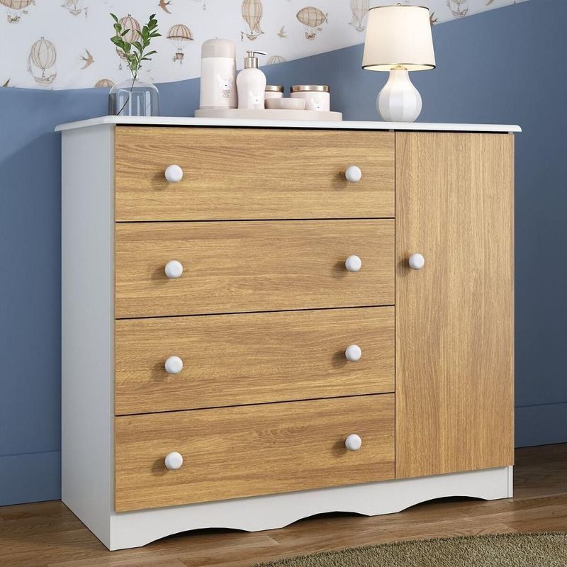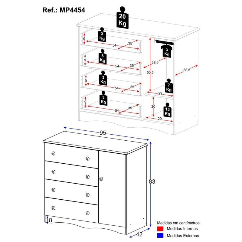 Cômoda Infantil 95cm 1 Porta E 4 Gavetas Realeza Multimóveis Mp4454 Branco/madeirado Branco/madeiradoA Cômoda Infantil 95cm 1 Porta e 4 Gavetas Realeza Multimóveis MP4454 foi criada para trazer mais leveza à rotina do bebê, oferecendo um cantinho organizado, delicado e cheio de aconchego. Cada detalhe foi pensado para facilitar o dia a dia dos pais e deixar o quarto ainda mais encantador. Um móvel que combina praticidade e carinho em cada gaveta.Diferenciais:- 3 anos de garantia contra defeitos de fabricação e material.- Produzida em madeira de reflorestamento (MDP 12/15mm) com acabamento acetinado (cerca de 20% de brilho): sustentabilidade e durabilidade.- 1 porta e 4 gavetas: amplo espaço interno para organizar roupinhas e acessórios.- Corrediças telescópicas: permitem a abertura total e o manuseio silencioso das gavetas.- Cabideiro em alumínio: acomoda as roupas para que não amassem.- Puxadores em ABS redondos e práticos.- Rodapé usinado em MDF: visual harmonioso.- Sistema antitombamento: proporciona segurança para o bebê e tranquilidade aos pais.Conteúdo da Embalagem:1 (uma) CômodaManual de MontagemKit FerragemDimensões do Produto Montado:Altura: 83cm | Largura: 95cm | Profundidade: 42cm*Você pode consultar as medidas detalhadas na imagem técnica do produto.Observações Importantes:*As cores do produto podem sofrer variações de tonalidade de acordo com as configurações do seu dispositivo.*Aqui na Loja Multimóveis, você pode concluir sua compra facilmente com toda segurança. A entrega é garantida e você está em 1° lugar.*Imagens meramente ilustrativas (decoração não inclusa).*O produto será entregue desmontado e não disponibilizamos o serviço de montagem. Acabamento: FF/Pintura UV | Material: MDP | Referência do Modelo: MP4454 | Coleção: Realeza | Instruções de Cuidado: Limpar com pano seco para retirar o pó. Não utilizar produtos químicos ou abrasivos a limpeza. Não aplicar lustra móveis. | Sistema de Montagem: O produto acompanha manual de montagem juntamente com kit ferragem. O produto será entregue desmontado e não disponibilizamos o serviço de montagem. | Produto Composto por: 1 cômoda, manual de montagem e kit ferragem. | Com Gaveteiro: Sim | Corrediça: Telescópica | Material do Puxador: ABS | Quantidade de Gavetas: 4 | Quantidade de Portas: 1 | Quantidade de Prateleiras: 1 | Altura Montado: 83 | Largura Montado: 95 | Profundidade Montado: 42 | Tamanho (L x A x P): 95 x 83 x 42 | Tonalidade: Branco | Peso do Produto: 33 | Garantia do Fabricante: 3 | É Desmontável: Não | Fabricante: Multimóveis | Produto: Cômoda | Altura (cm): 83 cm | Largura (cm): 95 cm | Profundidade (cm): 42 cm | Tempo de Garantia: 3 meses | Tipo de móvel: Cômoda | Material das gavetas: MDP | Com corrediças: Sim | Com portas: Sim | Material de dobradiças: Metal | Com prateleiras: Sim | Com prateleiras ajustáveis: Não | Requer Montagem: Sim | Inclui manual de montagem: Sim | Inclui acessórios de montagem: Sim | Peso (kg): 33 kg | Material do corpo: MDP | Estilo: Moderno | Marca: Multimóveis | Quantidade de caixas de embalagem: 02 | Destaque 1: Produzida em MDP: maior durabilidade e resistência. | Destaque 2: Gavetas com corrediças telescópicas: abertura total e silenciosa. | Destaque 3: Puxadores redondos em ABS: práticos e delicados. | Destaque 4: Rodapé: visual elegante e harmonioso. | Destaque 5: Tamanho do produto montado (L x A x P): 95 x 83 x 42 cm | Baterias são necessárias?: Não | Certificação de teste externa: N/A | Dimensões do item P x L x A: depth#value=42;depth#unit=centimeters;width#value=95;width#unit=centimeters;height#value=83;height#unit=centimeters | Is Fragile: Não | Peso do item: unit=kilograms;value=33 | Quantidade de itens: 1 | Número da peça: MP4454.697 | É resistente à umidade: Não | Com alças: Sim | Com pés: Não | Com rodas: Não | Tipo de Garantia: Garantia do Fabricante | Montagem: Necessita Montagem | País de Origem: Brasil | Altura do Produto com Embalagem: 20 cm | Largura do Produto com Embalagem: 46 cm | Comprimento do Produto com Embalagem: 101 cm | Tipo da embalagem do vendor: Sem embalagem adicional | Peso do Produto com Embalagem: 33000 g | Cor: Branco/Madeirado