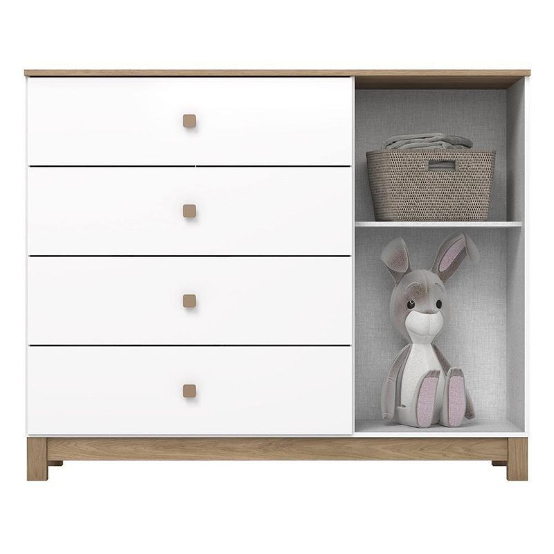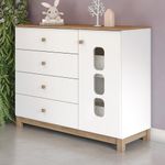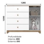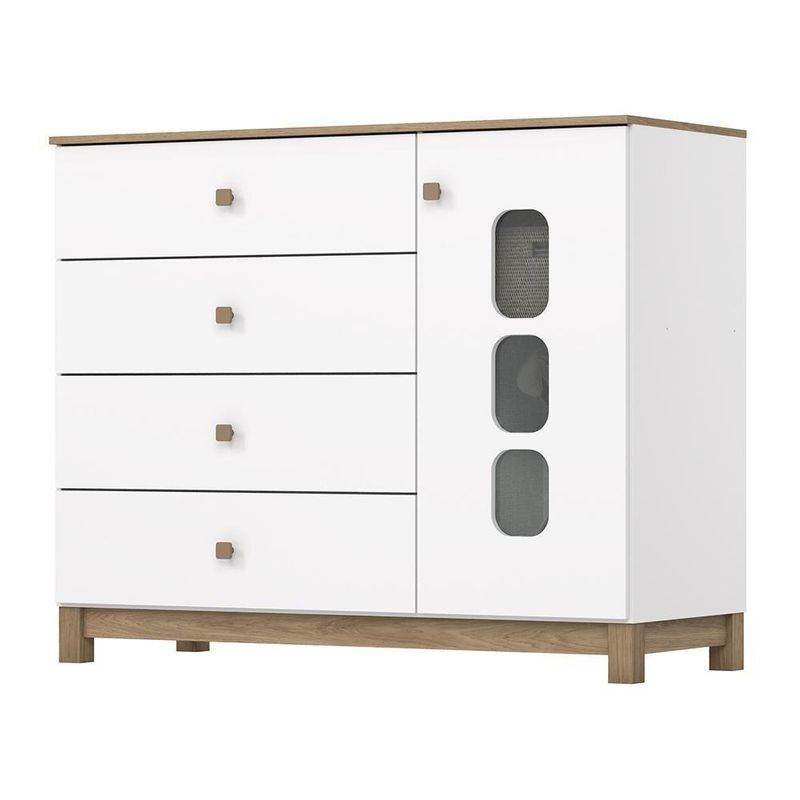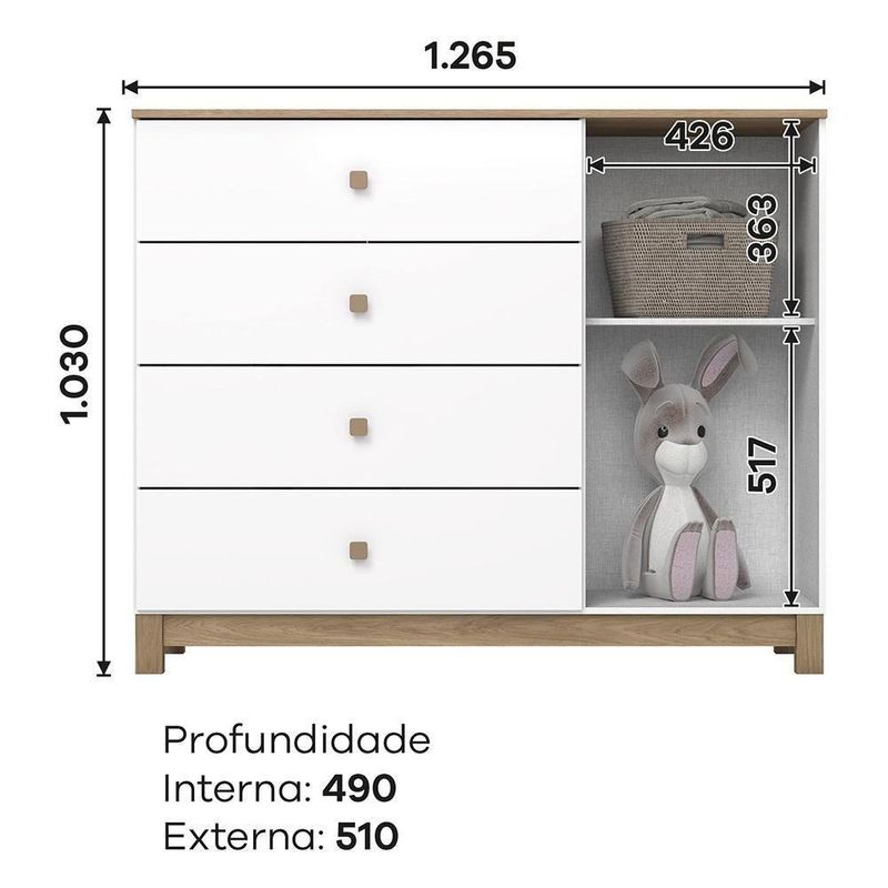 Cômoda Infantil Aconchego 1 Porta E 4 Gavetas Branco/jequitibá - Móveis Henn Branco/jequitibáCômoda Infantil Aconchego 1 Porta e 4 Gavetas - Móveis Henn A Cômoda Infantil Aconchego 1 Porta e 4 Gavetas é perfeita para manter o quarto infantil organizado com praticidade e elegância. Produzida em MDF e MDP, conta com pintura UV atóxica e acabamento brilho, garantindo durabilidade e fácil limpeza. Possui uma porta com dobradiças metálicas e prateleira interna, além de quatro gavetas com corrediças telescópicas que proporcionam abertura suave e melhor aproveitamento do espaço. Os puxadores em madeira com pintura e os pés em MDF revestido completam o design funcional, oferecendo amplo espaço interno para roupas e acessórios do dia a dia.ESPECIFICAÇÕES: - Estrutura em MDF e MDP - Pintura UV atóxica - Acabamento brilho - 1 Porta - Dobradiças metálicas - Prateleira - 4 Gavetas - Corrediças telescópicas - Puxadores em madeira com pintura - Pés em MDF revestido - Amplo espaço interno Dimensões: Tamanho do Produto (L x A x P): 126,5 x 103 x 51 cm Garantia: 3 meses Montagem: O Produto vai desmontado com manual e todos acessórios. Recomendamos que a montagem seja feita por um profissional Recomendação de Limpeza: Utilize pano levemente úmido Observações: - A LOJA se responsabilizará pela entrega dos produtos até onde as rodovias alcançam, entregas fluviais ou aéreas devem ser cotadas a parte. - As imagens são ilustrativas, não acompanham objetos de decoração. - A montagem será de responsabilidade do comprador. Não nos responsabilizamos, no ato da entrega, por subir escadas/elevadores ou transporte por guincho em apartamentos. Eventuais despesas são de responsabilidade do comprador. - Confira as dimensões do produto e certifique-se de que passará normalmente por supostos elevadores, portas, escadas e/ou corredores de sua residência. Para mais informações, acesse nossa Central de Atendimento. NA Cor: Branco/Jequitibá