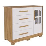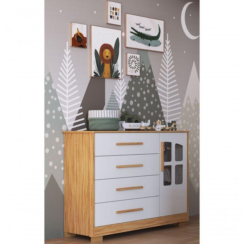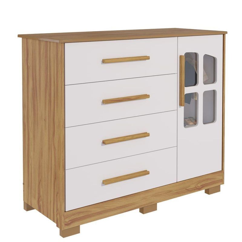 Cômoda Infantil Charlô 1 Porta 4 Gavetas - Móveis Peroba Amendoa/brancoA Cômoda Charlô 1 Porta é um produto 100% MDF e possui pintura atóxica. Seu caixote é em chapa de 12 mm, enquanto o tampo superior, as frentes e as molduras são em chapa de 15 mm de espessura. Seus pés são injetados em plástico de alta resistência. Os puxadores são fabricados em MDF revestido com papel melamínico. Possui cabideiro metálico, gavetas com corrediças telescópicas e porta com detalhe em PETG cristal. Aceita adaptação de kit divisórias de gavetas (vendido separadamente).MedidasAltura (cm) 102,6Largura (cm) 120,3Profundidade (cm) 50,3Material PrincipalMDFMaterial dos FundosHDFAcabamento PrincipalVerniz UVLimpeza e ConservaçãoPara limpeza utilizar somente pano limpo e macio, ligeiramente umedecido em água (apenas o bastante para remover a poeira), seguido de um pano seco.Necessita de MontagemSimComplexidade da MontagemAlta: deve ser montado por um montador especializado.Qtd de Prateleiras2Material da PrateleiraMDFEscala de Brilho da PrateleiraSemibrilhoPeso Máximo por Prateleira (kg)5Qtd de Gavetas4Acabamento da GavetaPintura UV e Fita de BordoTipo de Puxador da GavetaPerfil externoMaterial do Puxador da GavetaMDF revestidoObservações:- Todos os produtos têm três (03) meses de garantia fornecida pelo fornecedor- As imagens são meramente ilustrativas, os objetos que ambientam as fotos não acompanham o produto.- Pode haver alguma diferença de tonalidade entre a foto e o produto, devido ao tratamento de imagens e a calibração do monitor- A entrega é realizada por transportadora, não nos responsabilizamos, no ato da entrega por desmontagens, subir escadas/elevadores ou transporte por guincho para apartamentos- Eventuais despesas são de responsabilidade do cliente- Confira as dimensões dos volumes e certifique-se de que passará normalmente por supostos elevadores, portas, escadas ou corredores- Ao receber a mercadoria, verifique as condições da embalagem, caso haja alguma avaria, entre em contato com nosso SAC- Nossa empresa não se responsabiliza pela montagem dos produtos, mas todos os produtos possuem manual de montagem. Recomendamos que a montagem seja feita por profissional de sua confiança.