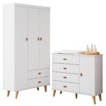 Cômoda Infantil Com Guarda Roupa 3 Portas Duda Branco Acetinado Bétula - CarolinaCômoda Infantil com Guarda Roupa 3 Portas Duda Branco Acetinado Bétula - CarolinaEstá chegando a tão esperada hora de conhecer seu pequeno e está procurando moveis infantis para montar seu quartinho, a Carolina Baby pensando em tornar esse momento ainda mais especial desenvolveu com todo amor, carinho e cuidado a linha Duda. Apresentamos a vocês a Cômoda Infantil com Porta e o Guarda Roupa 3 Portas que conta com um lindo design na cor Branco Acetinado com Pés estilo Retrô na cor Bétula proporcionando modernidade ao ambiente, possui um amplo espaço interno para maior organização e praticidade na hora de arrumar as roupinhas, sapatinhos e acessórios do seu baby, fabricado com materiais de excelentes qualidades para melhor lhe atender, com sistemas de Travas Anti-Tombamento para maior segurança e tranquilidade da mamãe e do papai evitando acidentes. Confira abaixo detalhes desse lindo conjunto e garanta o seu!Cômoda Infantil Retrô Duda Branco Acetinado Bétula - CarolinaCaracterísticas Técnicas: - Desenvolvida em MDP/MDF - Acabamento em pintura U.V na cor Branco Acetinado - Sistema de pintura com tinta atóxica, que não tem cheiro e não faz mal a saúde do bebê - Possui 01 Porta - 01 Prateleira - 04 Gavetas - Corrediças metálicas que deslizam livres de enrosco - Sistema de travas anti-tombamento, fixado na parede - Kit 05 Pés Retrô em madeira maciça na cor Bétula - Amplo espaço interno, maior organização - Lindo e moderno designDimensões: Altura: 92 cm Largura: 93,6 cm Profundidade: 41,5 cmGuarda Roupa Infantil Retrô Duda 3 Portas Branco Acetinado Bétula - CarolinaCaracterísticas Técnicas: - Desenvolvido MDF/MDP - Acabamento em pintura U.V na cor Branco Acetinado - Sistema de pintura com tinta atóxica, que não tem cheiro e não faz mal a saúde do bebê - Possui 03 Portas - 03 Prateleiras - 02 Gavetas - Corrediças metálicas que deslizam livres de enrosco - Sistema de travas anti-tombamento, fixado na parede - Kit 04 Pés Retrô em madeira maciça na cor Bétula - Amplo espaço interno, maior organização - Lindo e moderno designDimensões: Altura: 190 cm Largura: 93,5 cm Profundidade: 42 cmObs: Não realizamos a montagem, porém acompanha manual de instruções.