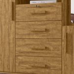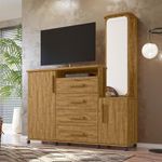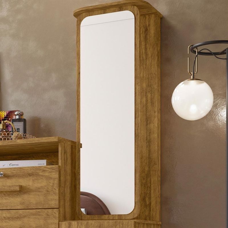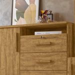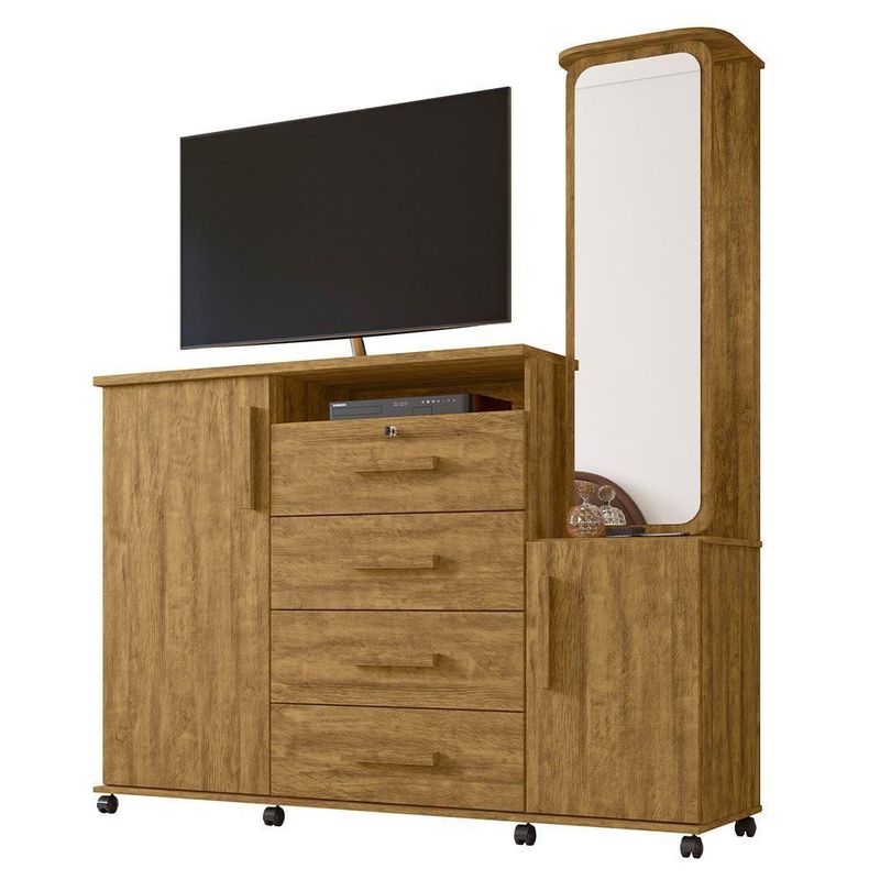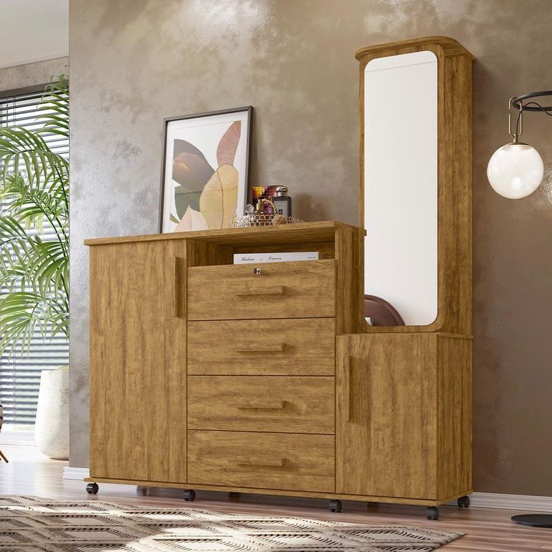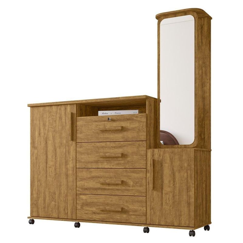 Cômoda De Madeira Lukaliam Copacabana 4 Gavetas 2 Portas Com EspelhoAliada a organização do seu dormitório, a Cômoda Copacabana Lukaliam vai garantir um dia a dia mais otimizado e um ambiente bem decorado. Vem com espelho giratório e porta objetos atrás, que oferece praticidade para visualizar o look e permite fazer a maquiagem com seus itens necessários mais acessíveis. A cômoda para quarto conta com 02 portas e espaço interno para sapatos e objetos, onde uma das partes possui cabideiro em alumínio, ideal para pendurar e guardar calças e camisas. Possui prateleira removível e um nicho para eletrônico ou decoração, proporcionando versatilidade na organização. Essa comoda com sapateira tem 04 gavetas com corrediças telescópicas e trava no fundo da gaveta, que oferecem mais segurança ao abrir, evitando que elas saiam completamente do móvel. A cômoda com gavetas tem o tampo resistente que suporta colocar televisores ou aparelho de som. Os puxadores amaderados no formato ergonômico, trazem um visual mais arrojado e fácil de manusear. Fabricada com madeira MDP a comoda com espelho tem uma estrutura de alta durabilidade que concilia praticidade para montar e desmontar o móvel garantindo sua vida útil. A pintura U.V. e acabamento fosco dessa cômoda de madeira, garante um aspecto novo por mais tempo, sem contar os pés em rodízio que merecem destaque por trazer a praticidade em mudar o móvel de lugar, além de proporcionar mais facilidade na limpeza do ambiente. Agora é só combinar a Cômoda Copacabana Lukaliam com o restante do mobiliário e conquistar o quarto dos seus sonhos. Cor: Amendoa