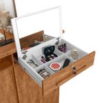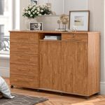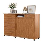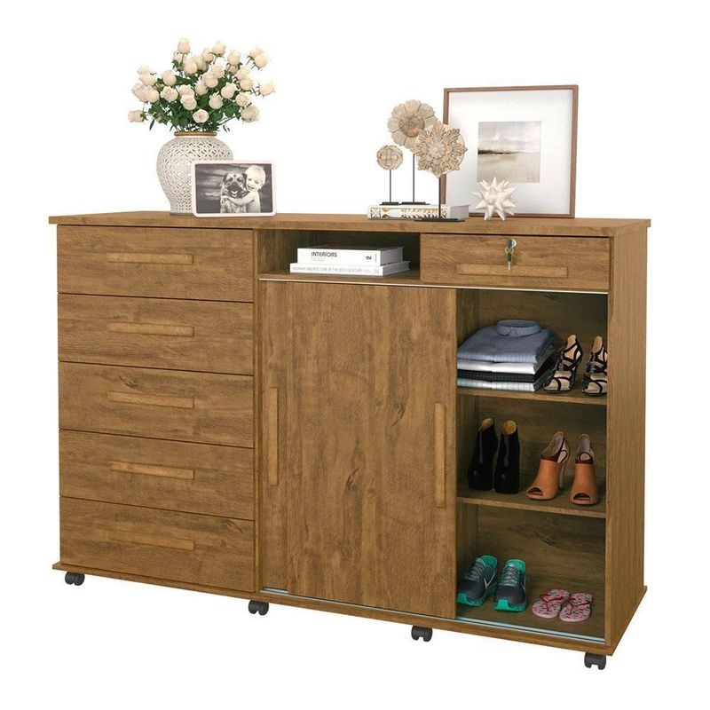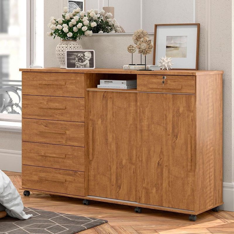 Cômoda Madeira 6 Gavetas Rodizios Amêndoa Max New Lukaliam AmêndoaA cômoda Max New Lukaliam é perfeita para sua casa. Além de decorativa, ela possui bastante espaço interno para auxiliar você na organização do seu ambiente. Ela tem 2 portas reversíveis capazes de mudarem de posição e que permitem a acomodação da cômoda para quarto de acordo com o layout do seu espaço. As 6 gavetas com corrediças telescópicas e sistema de travamento revelam um espaço ideal para você organizar seus objetos com mais comodidade. A gaveta com chave dessa cômoda de madeira traz mais segurança e proteção, além de revelar um espelho interno capaz de deixar seu ambiente com mais charme e versatilidade para as tarefas do dia a dia como se maquiar e conferir o visual. As prateleiras da cômoda gaveteiro oferecem a oportunidade de organizar seus utensílios com mais praticidade. Os pés em rodízio ajudam na locomoção da cômoda espelhada e o tampo em MDP de 25mm é resistente e próprio para você dispor seus objetos e itens decorativos. O cabideiro e o trilho em alumínio são resistentes e fáceis de usar, trazendo a praticidade para o seu dia. Os puxadores em madeira MDF favorecem a elegância e deixam esse produto mais bonito e inovador. A estrutura em madeira MDP é resistente e preparada com um material capaz de fornecer o acabamento perfeito e durável, isso sem contar a pintura com acabamento em fosco que deixa essa cômoda moderna perfeita para compor o seu dormitório. Cor: Amendoa Cor: Amêndoa