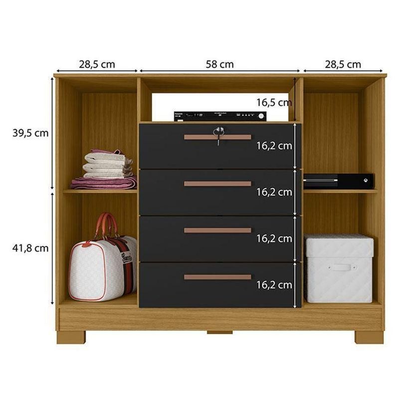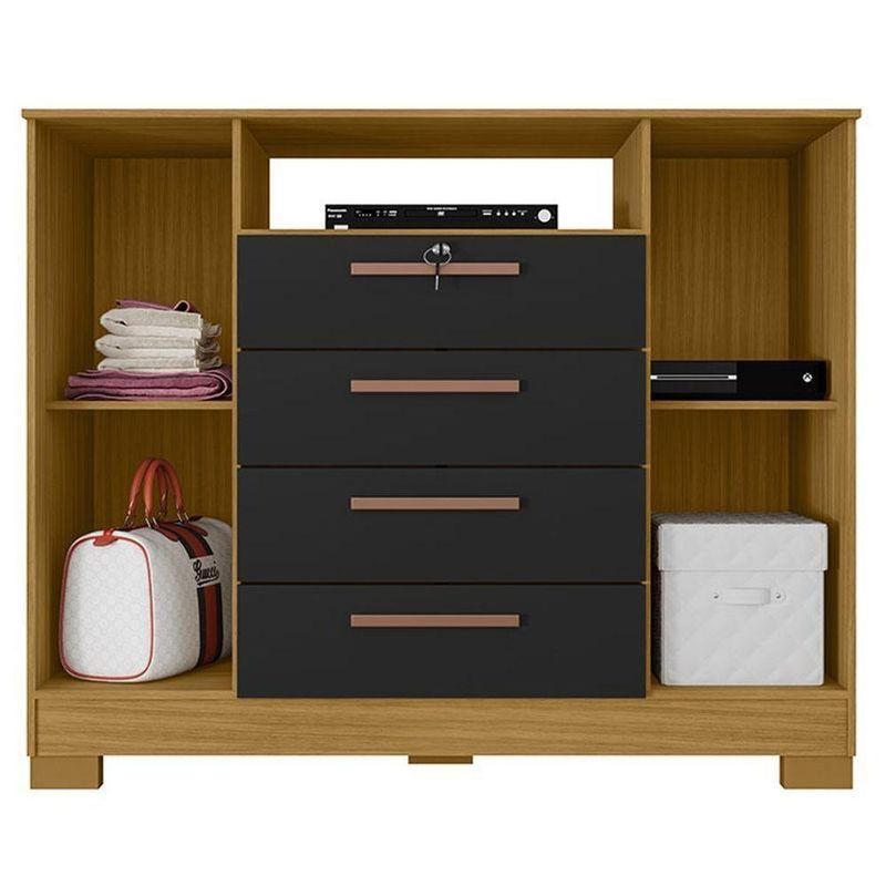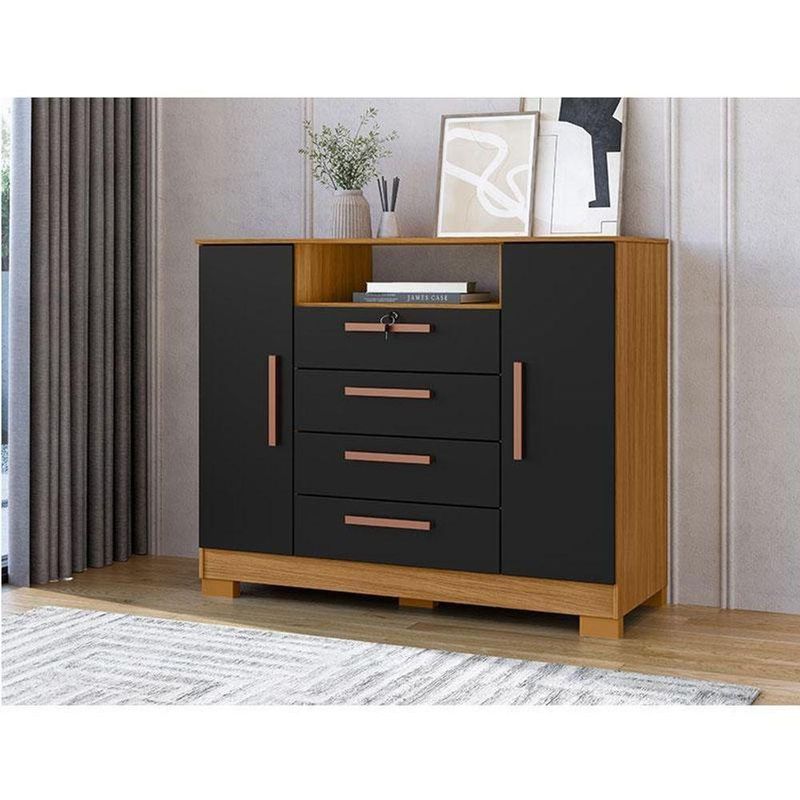 Cômoda Madri 4 Gavetas 2 Portas Carvalho Americano Preto - IncorplacCômoda Madri 4 Gavetas 2 Portas Carvalho Americano Preto - IncorplacApresentamos a Cômoda da linha Madri, um elegante e funcional móvel de quatro gavetas e duas portas, projetado para oferecer soluções práticas de armazenamento e estilo para o seu ambiente, tornando seu dia a dia mais organizado. Com um design inovador, a cômoda combina perfeitamente com diversos estilos de decoração, proporcionando um toque moderno ao seu espaço. Fabricado pela Incorplac com materiais de ótima qualidade para maior durabilidade do móvel. Aproveite! Características Técnicas: - Desenvolvido em MDP de 12/15 mm - Acabamento em pintura U.V texturizado na cor Carvalho Americano Preto - Possui 02 Portas com dobradiças metálicas - 04 Gavetas sendo a primeira com chave - Corrediças metálicas livres de enrosco - Peso suportado pelas gavetas é de 3Kg cada - 02 Prateleiras suportando 5Kg cada - Peso suportado pelo tampo é de 8KG - Puxadores em PVC - Kit 6 pés de plástico - Amplo espaço - Lindo design Dimensões: Altura: 98,6 cm Largura: 120,4 cm Profundidade: 47 cm Informações importantes: - Não acompanha decorações e acessórios - Nossas cargas possuem seguro, portanto, no ato da entrega, confira a quantidade de volumes recebida, e também o estado da embalagem. Se houver qualquer inconsistência, não assine o comprovante de entrega; - O armazenamento do produto no endereço de entrega é de responsabilidade do comprador. Evite apoiar o produto na vertical, bem como evite áreas que deixem o produto exposto a chuva ou umidade excessiva; - Pequenas variações de tonalidade são possíveis, em razão da diferença de resolução da tela onde o anúncio está sendo visualizado. Se notar diferença expressiva, comunicar a empresa antes de efetuar a montagem; - O serviço de entrega contratado contempla a entrega até a primeira área coberta ou portaria, não sendo coberto o ato de subir escadas/elevadores ou adentrar nas residências; - Não nos responsabilizamos pela montagem, desmontagem ou instalação do produto NA