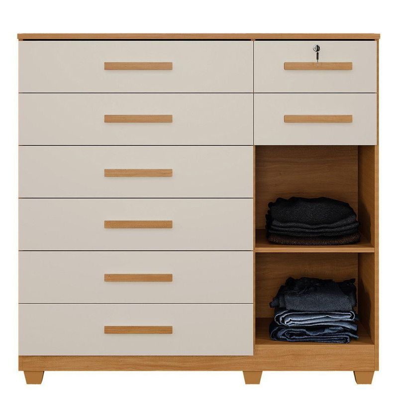 Cômoda New Vitoria 8 Gavetas Com Sapateira - Benetil Cinamomo OffA Comoda New Vitoria complementa seu quarto com charme e sofisticacao, combinando praticidade e beleza. Com oito gavetas espacosas, sendo uma com chave para maior seguranca, oferece organizacao e seguranca para seus itens pessoais. Suas corredicas telescopicas proporcionam suavidade e resistencia no uso diario. Conta ainda com uma porta e prateleira interna, formando uma sapateira bem estruturada. Fabricada em chapa de 15 mm, garante durabilidade e robustez superiores. Com a tecnologia MDP Perfect, alia sustentabilidade e inovacao, proporcionando longa vida util e facil manutencao. A pintura UV de alta resistencia e facil de limpar e ecologicamente correta, feita com madeira de reflorestamento para uma escolha mais sustentavel.Caracteristicas: Material Principal: Mdp Espessura Da Chapa: 15 Mm Escala De Brilho: Semi Brilho Acabamento: Pintura UV Sistema De Montagem: Parafuso, Cavilha E Cantoneiras Metalicas Quantidade de Gavetas: 08 Quantidade de Portas: 01 Dimensoes: Altura:135,5 cm Largura: 122,5 cm Profundidade: 45 cm Peso: 70,1 Kg Garantia Do Fornecedor: 3 Meses Recomendacoes de uso, manutencao e limpeza: Limpar com flanela ou pano macio e seco, nao utilizar produtos abrasivos, desengordurantes, alcool ou solvente. Nao expor o produto diretamente a luz solar e a umidade.