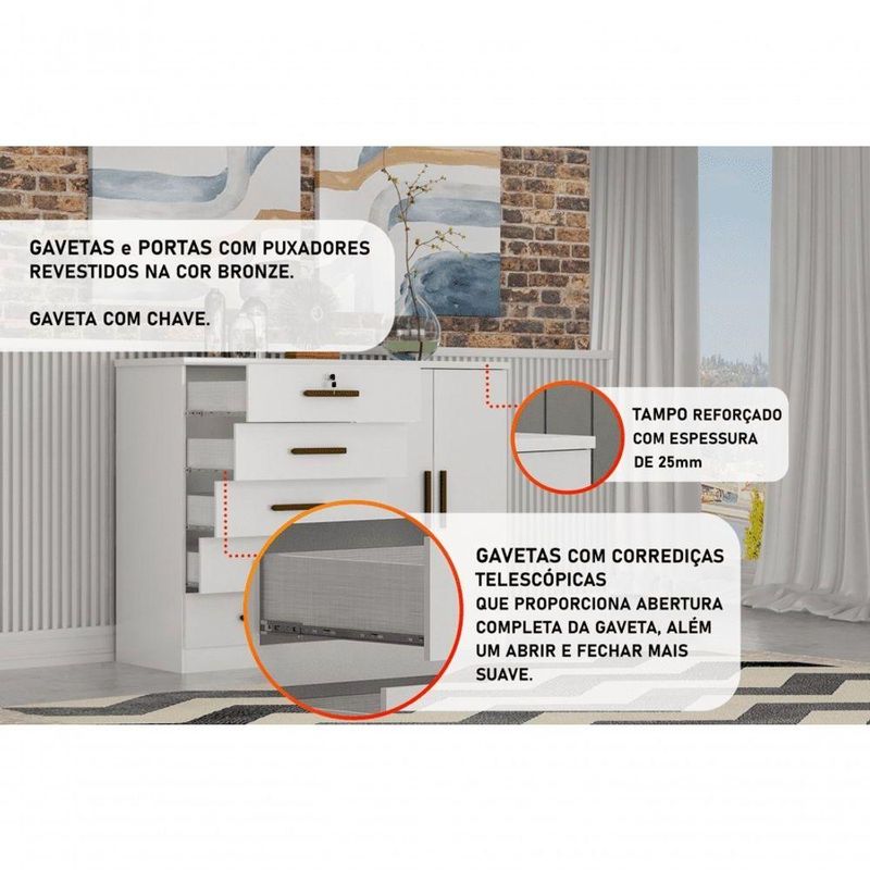 Cômoda Para Quarto Com Sapateira 5 Gavetas - Seul-branco - Móveis HorizonteCômoda para Quarto com Sapateira 5 Gavetas - Seul-Branco - Móveis HorizonteCom a Cômoda Seul seu quarto estará completo e seus pertences bem organizados, uma aliada na organização de seu quarto. Fabricada em MDF e MDP, possui 5 gavetas com corrediças telescópicas e sapateira ampla. As corrediças telescópicas são feitas de aço e por isso são mais resistentes e duráveis, permitindo um deslize suave e uma abertura total da gaveta. Agora é só combiná-la com seu mobiliário e conquistar o quarto dos seus sonhos! Aproveite!Faz parte deste anúncio:Cômoda para Quarto com Sapateira 5 Gavetas - SeulObs: Objetos de decorações não inclusos.Particularidades da Cômoda:Características:- Produzido com MDF e MDP- 5 Gavetas com corrediças telescópicas- Sapateira- Puxadores em alumínio bronze- Tampo reforçado de 25mm- Gaveta com chave de Dimensões:Altura: 1 metrosLargura: 1,36 metrosProfundidade: 45 centímetrosInformações Importantes:.-Produtos podem apresentar diferenças de tonalidades entre a foto na tela e o produto real, devido a calibração de cor de tela.-Limpar com flanela ou pano macio. Não utilizar álcool. Não utilizar produtos abrasivos ou corrosivos.-Nós prezamos pela qualidade da em primeiro lugar, trabalhamos com transportadoras altamente selecionadas e os melhores materiais de embalagem.-A montagem é de total responsabilidade do comprador. Antes de comprar, verifique o espaço disponível para a montagem.-Certifique-se de que o produto caiba em elevadores e vãos de escadas, não fazemos içamentos. Quaisquer despesas deste tipo ficam a cargo do cliente-Garantia de 3 meses contra de fabricação.
