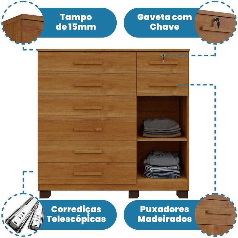 Cômoda Pernambuco 8 Gavetas 1 Porta Com Sapateira - Benetil CinamomoA Comoda Pernambuco complementa seu quarto com charme e sofisticacao, combinando praticidade e beleza. Com oito gavetas espacosas, sendo uma com chave para maior seguranca, oferece organizacao e seguranca para seus itens pessoais. Suas corredicas telescopicas proporcionam suavidade e resistencia no uso diario. Conta ainda com uma porta e prateleira interna, formando uma sapateira bem estruturada. Fabricada em chapa de 15 mm, garante durabilidade e robustez superiores. Com a tecnologia MDP Perfect, alia sustentabilidade e inovacao, proporcionando longa vida util e facil manutencao. A pintura UV de alta resistencia e facil de limpar e ecologicamente correta, feita com madeira de reflorestamento para uma escolha mais sustentavel.Caracteristicas: Material Principal: Mdp Espessura Da Chapa: 15 Mm Escala De Brilho: Semi Brilho Acabamento: Pintura UV Sistema De Montagem: Parafuso, Cavilha E Cantoneiras Metalicas Quantidade de Gavetas: 08 Quantidade de Portas: 01 Dimensoes: Altura:135,5 cm Largura: 122,5 cm Profundidade: 45 cm Peso: 70,1 Kg Garantia Do Fornecedor: 3 Meses Recomendacoes de uso, manutencao e limpeza: Limpar com flanela ou pano macio e seco, nao utilizar produtos abrasivos, desengordurantes, alcool ou solvente. Nao expor o produto diretamente a luz solar e a umidade.