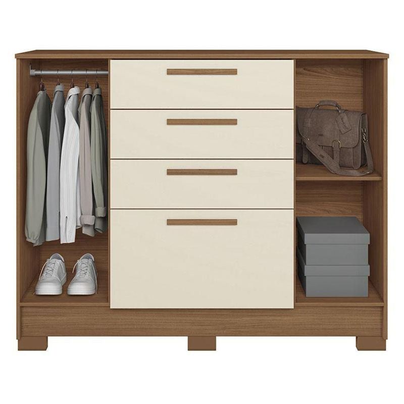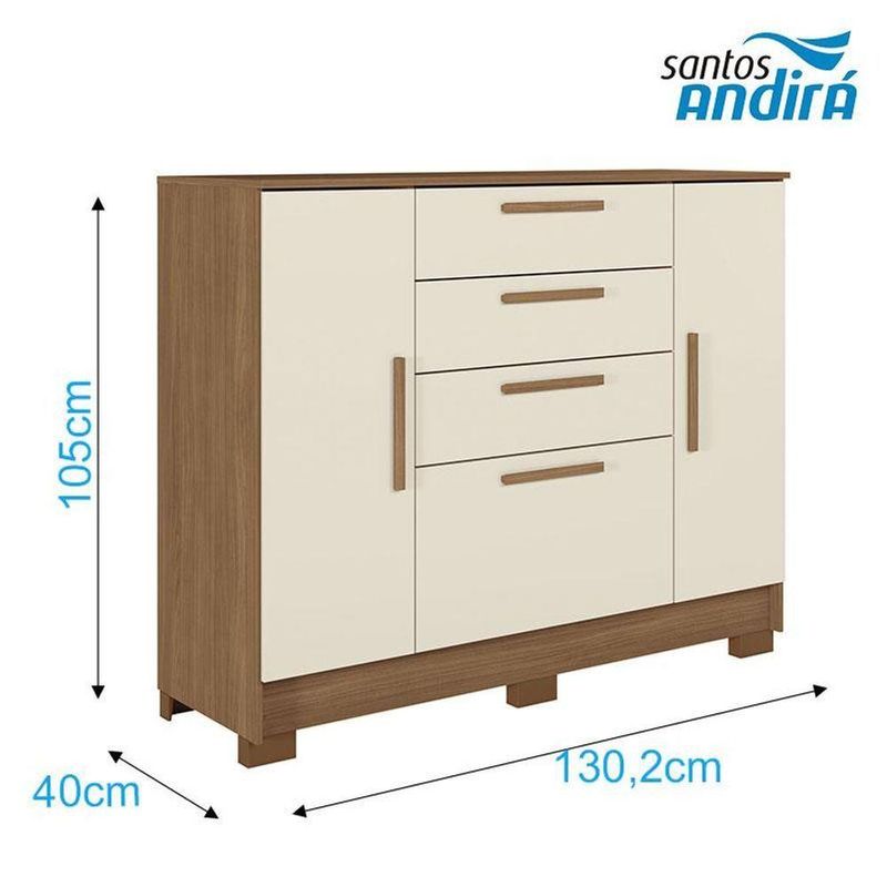 Comoda Pinhais 2 Portas 4 Gavetas Jatobá Areia Acetinado - Santos AndiráComoda Pinhais 2 portas 4 Gavetas Jatobá Areia Acetinado - Santos AndiráComoda Pinhais 2 portas 4 Gavetas Jatobá Areia: Uma cômoda compacta e funcional, ideal para manter o quarto sempre organizado. Com gavetas espaçosas e portas que facilitam o armazenamento, ela une praticidade e design moderno. Acabamento fosco e visual versátil, perfeita para quem busca beleza e organização no dia a dia.Características técnicas:- Desenvolvida em MDP- Pintura em verniz fosco- Gavetas com Corrediças Telescópicas- Puxadores em MDF revestido- 01 Cabideiro/calceiro de aluminio- 02 Amplas prateleirasDimensões:Altura: 105 cmLargura: 130,2 cmProfundidade: 42 cmInformações importantes:* Não acompanha decorações e acessórios* Nossas cargas possuem seguro, portanto, no ato da entrega, confira a quantidade de volumes recebida, e também o estado da embalagem. Se houver qualquer inconsistência, não assine o comprovante de entrega;* O armazenamento do produto no endereço de entrega é de responsabilidade do comprador. Evite apoiar o produto na vertical, bem como evite áreas que deixem o produto exposto a chuva ou umidade excessiva;* Pequenas variações de tonalidade são possíveis, em razão da diferença de resolução da tela onde o anúncio está sendo visualizado. Se notar diferença expressiva, comunicar a empresa antes de efetuar a montagem;* O serviço de entrega contratado contempla a entrega até a primeira área coberta ou portaria, não sendo coberto o ato de subir escadas/elevadores ou adentrar nas residências;* Não nos responsabilizamos pela montagem, desmontagem ou instalação do produto.