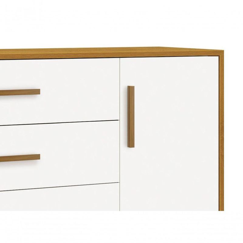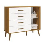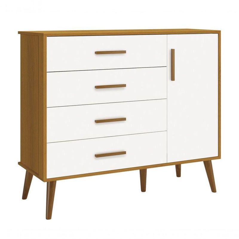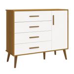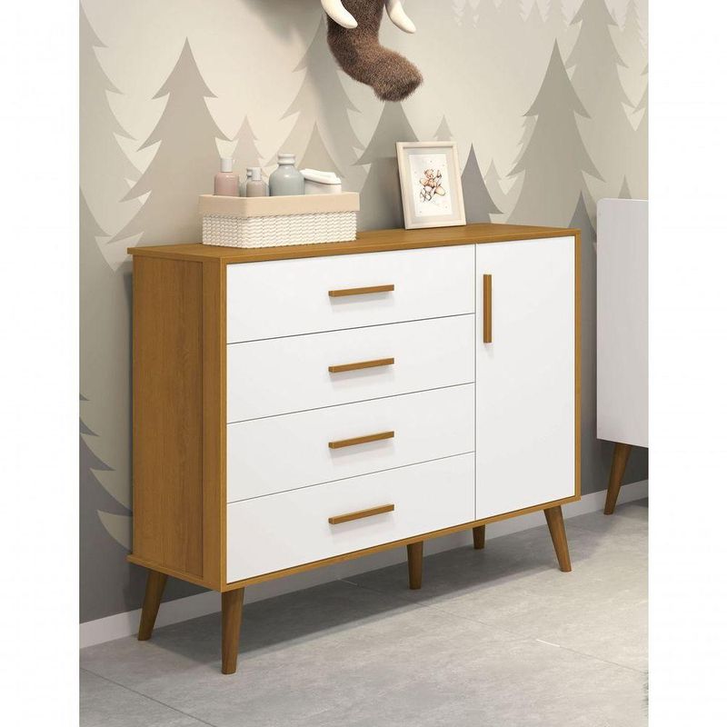 Cômoda Sapateira Retrô Isis Branco Fosco Com Savana Fosco - MoveisaquiEvidênciando um ar retrô com o modelo de seus pés em madeira maciça, a Cômoda Sapateira Retrô Isis - MóveisAqui possui um desing clean que combina com vários estilos de decoração. É perfeita para a organização das roupinhas e acessórios do seu baby, proporciona um mega espaço para armazenamento e com divisória interna, para que a organização do dia-a-dia possa ser mais fácil. Possui puxadores em MDF envelopado.Dimensões do Produto Montado:Altura: 91 cmLargura: 133 cmProfundidade: 46 cmObservações:- 04 gavetas;- 01 porta;- 01 prateleira interna;- Corrediças Telescópicas;- Puxadores em MDF;- Sistema anti Tombamento;- Pés na cor Madeira;- Pintura ultravioleta com acabamento fosco.