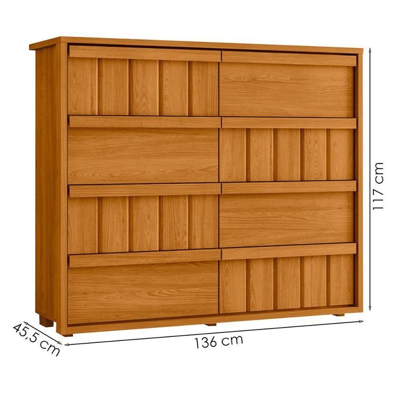 Comoda Tarsila 8 Gavetas Mdf 136 Cm Cumaru Opala MadetecA Cômoda Tarsila combina sofisticação e praticidade para transformar seu ambiente com elegância e funcionalidade! Estrutura 100% MDF 15/25 mm e acabamento em pintura UV. Possui gavetas com corrediças telescópicas e detalhes em ripado angular, puxadores em estilo cava, moldura envoltória e tampo 25 mm. NÃO ACOMPANHA OBJETOS NEM DEMAIS DECORAÇÕES. Este produto será entregue em 2 volumes.Medidas:Altura: 117 cmLargura: 136 cmProfundidade: 45,5 cmEspecificações Técnicas:Modelo: TarsilaMateriais: MDFEstilo: ModernoPeso máximo suportado: 34 Kg distribuídosSistema de montagemParafusos, pregos, cantoneiras e cavilhasManual de montagem inclusoMontagem, desmontagem e outras instalações serão de responsabilidade do cliente!Recomendação de LimpezaPara a limpeza, utilize um pano seco para retirada do pó.Evite utilizar produtos abrasivos e o contato direto com a umidade.A Cômoda Tarsila combina sofisticação e praticidade para complementar o dia dia!Importante SaberAs imagens são meramente ilustrativas, não acompanham objetos de decoração e eletrônicos.A tonalidade da cor do produto pode variar de acordo a calibração de cores do seu monitor, a iluminação do ambiente ou sua percepção visual.O cliente deve verificar a quantidade de VOLUMES descritos na nota, a situação da embalagem, caso haja algum dano NÃO ASSINE o comprovante de recebimento e RECUSE a mercadoria.Não nos responsabilizamos por subir escadas/elevadores ou pelo transporte por guincho em apartamentos. Eventuais despesas são de responsabilidade do comprador.Confira as dimensões do produto e certifique-se de que passarão normalmente por supostos elevadores, portas, escadas ou corredores de sua residência. Recomendamos que o responsável pelo recebimento confira se os produtos entregues correspondem ao modelo e à quantidade adquirida.Garantia De Fábrica90 dias para eventuais defeitos de fabricação.NA | Cor: Cumaru Opala