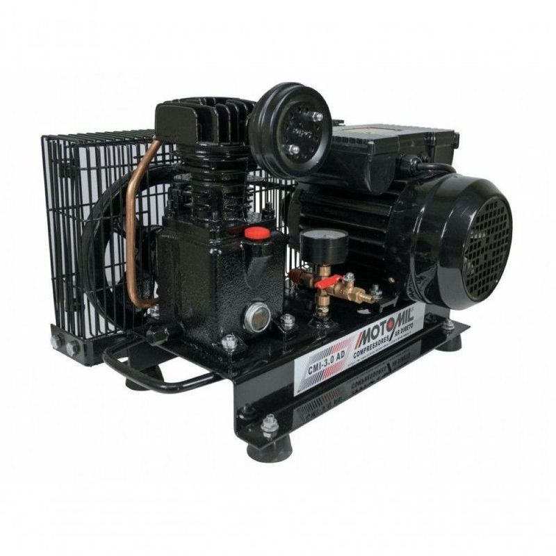 Compressor Ar Direto Com Motor 1hp 4 Polos Bivolt Cmi-3,0ad MotomilCOMPRESSOR AR DIRETOCompressor de ar direto de pistão, monofásico com lubrificação à óleo.Ideal para extração e captação de Água em lençóis freáticos através de poços artesianos e outras aplicações.Possui: pé de borracha, visor de nível de óleo, regulador de pressão de saída.Dados Técnicos:Tensão:127/220V ? BIVOLT ? 4 polos (Cód.: 31373.1)Número de fases: MonofásicoFrequência: 60 HzPotência do motor: 1,0 HPDeslocamento Teórico: 3,0 pés³/min ? 85 l/minNúmero de estágios: 1 estágioNúmero de pistão: 1 em linhaNúmero de polos: 2 ou 4 polosPressão de operação (Mínimo): 80 lbf/pol² - 5,5 barRotação da unidade compressora: 950 rpmVolume de óleo: 200 ml NA
