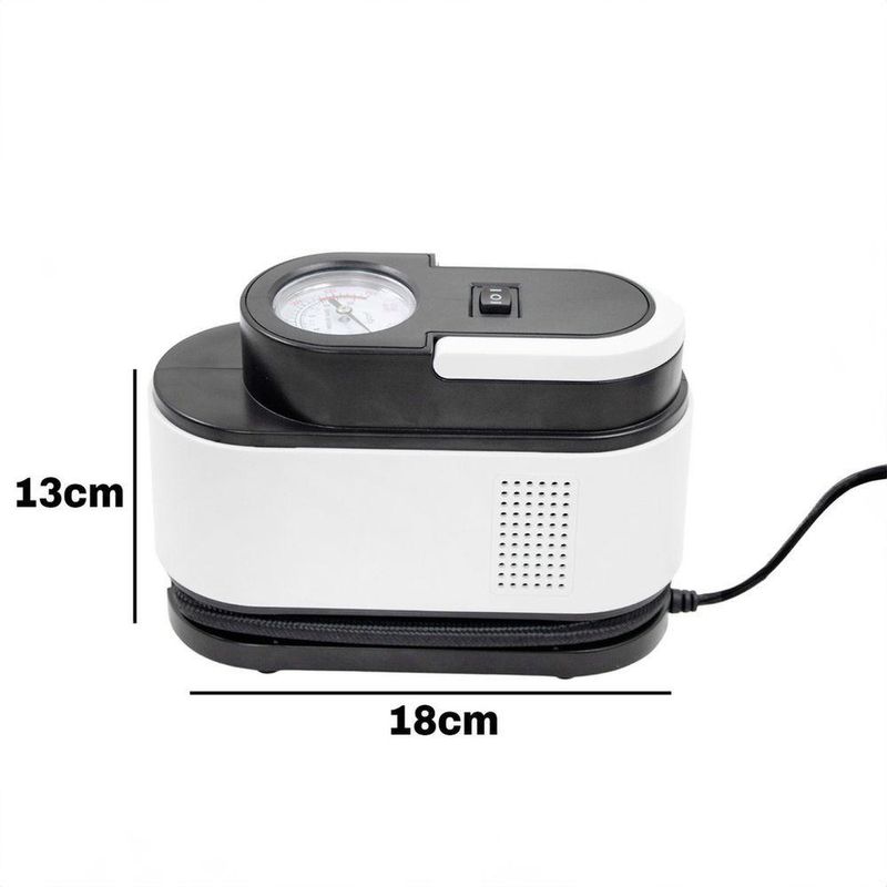 Compressor Ar Veicular Eletrico Portatil 12v Calibrador Carro Pneu Bicicleta BolaCompressor Ar Veicular Elétrico Portátil 12v Calibrador Carro Pneu Bicicleta BolaA Bomba De Ar Elétrica Portátil é leve e compacta, podendo encher pneus de carro, bicicleta, motos, boias, balões, etc. É portátil podendo ser usado pelo plug acendedor de cigarro 12V, podendo ser levado para todos os lugares dentro do carro, da mochila ou bolsa. Acompanha diferentes bicos para encher boias, bolas, mangueira para pneus, e possui uma alça e lanterna embutidas.Especificações Técnicas:- Modelo: Compressor De Ar Elétrico 12V- Material: Plástico, Metal, Componentes Elétricos.- Voltagem: 12V- Potência Máx.: 120W- Potência Máx.: 150PSI- Fluxo de Ar Máx.: 35L/min- Unidades do Medidor: PSI, BAR, KPA.- Comprimento Aprox. da Mangueira: 50cm- Comprimento Aprox. do Cabo de Energia: 2,80M- Dimensões Aprox.: 18cm (Comprimento) X 7,5cm (Largura) X 13cm (Altura)- Peso Aprox.: 700gItens Inclusos na Embalagem:- 01x Compressor De Ar Elétrico- 01x Bico Para Boia 50mm- 01x Bico Para Boia 58mm- 01x Bico Agulha- 01x Fusível Extra