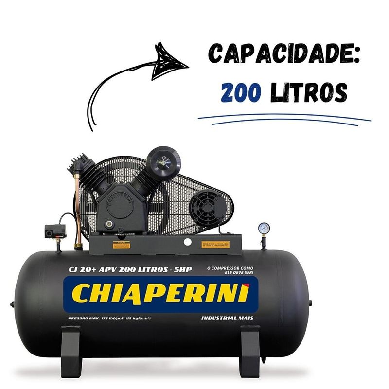 Compressor de Ar 20 Pés 5 HP 200 Litros 175 Libras Trifásico CJ 20+ APV CHIAPERINIÉ um equipamento de alta eficiência, projetado para atender às necessidades de empresas e oficinas de média e alta exigência, como marcenarias, serralherias, postos de serviços e até mesmo em ambientes rurais como sítios e fazendas. Com um design robusto e um desempenho superior, esse compressor proporciona maior vazão de ar e é ideal para aplicações que exigem alta pressão, como calibração de pneus até 125lbs/pol².Com um bloco compressor em ferro fundido e sistema de trabalho em V, esse modelo conta com rolamento tipo agulha na biela de alta pressão, proporcionando um funcionamento suave e durável. Sua transmissão por correia garante um desempenho confiável, e o sistema de proteção dupla nas partes girantes assegura a segurança durante o uso. O reservatório horizontal de 200 litros é projetado para suportar grandes volumes de ar e proporciona um tempo de enchimento de apenas 5 minutos e 45 segundos, tornando-o altamente eficiente em ambientes de trabalho dinâmicos.Este compressor é equipado com um motor monofásico ou trifásico de 5 HP (3,75 kW), oferecendo potência suficiente para atender a uma ampla gama de necessidades industriais. Além disso, possui válvula de retenção, dreno, válvula de segurança, manômetro e filtro de ar, todos componentes essenciais para garantir a segurança e o bom funcionamento do equipamento. Para tranquilizar os usuários, o compressor acompanha prontuário de vaso de pressão, elaborado conforme a norma NR-13 do MT e atestado por engenheiro mecânico, e todos os reservatórios passam por testes hidrostaticamente.O Compressor CJ 20+ Apv é uma escolha robusta, confiável e de fácil manutenção, ideal para quem busca um equipamento de alta pressão com baixo custo operacional.O Compressor de Ar CJ 20+ APV CHIAPERINI é a escolha ideal para quem precisa de um equipamento confiável, robusto e com excelente desempenho para trabalhos pesados. Com garantia de 12 meses e certificações que atestam a segurança e qualidade do produto, ele se destaca como uma solução eficiente para diversos setores industriais.VANTAGENS E BENEFÍCIOSAlta capacidade de carga: Com um reservatório de 200 litros e uma pressão máxima de 175 PSI (12 bar), este compressor é ideal para atividades de média e alta exigência, proporcionando ar comprimido eficiente para diversas aplicações.Compressor de 2 estágios: A tecnologia de dois estágios garante uma maior eficiência na compressão do ar, oferecendo uma vazão de 567 l/min (20 PCM) e redução no tempo de operação, sendo perfeito para ambientes com alta demanda.Motor potente de 5 HP: O motor de 5 HP (3,75 kW) garante potência suficiente para operar sob condições desafiadoras, com desempenho consistente.Design robusto e eficiente: O bloco compressor em ferro fundido com sistema de trabalho em V e rolamento tipo agulha na biela de alta pressão garante durabilidade e confiabilidade no longo prazo.Sistema de segurança avançado: Com proteção dupla nas partes girantes e válvula de segurança, o compressor oferece operação segura e sem riscos.DADOS TÉCNICOSTipo de motor: Monofásico ou trifásicoPotência do motor: 5 HP (3,75 kW)Capacidade do reservatório: 200 LitrosPressão máxima: 175 PSI (12 bar)Vazão: 567 l/min (20 PCM)Número de cilindros: 2Número de estágios: 2RPM do bloco: 1050 rpmTempo de enchimento: 5 minutos e 45 segundosDimensões com embalagem: 1450 x 620 x 1150 mmPeso com embalagem: 182 kgPeso do cabeçote: 41,5 kgTipo de correia: A65Diâmetro da polia: 128 mmDiâmetro do volante: 422 mmVolume de óleo lubrificante: 900 mlProntuário de vaso de pressão, conforme NR-13 e ASMEGarantia: 12 mesesReferência: 688Marca: CHIAPERINI* Imagens meramente ilustrativas