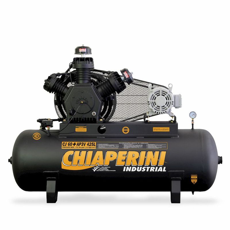 Compressor de 2 estágios e alta pressão (175lbf/pol²) com rolamento cônico dando melhor ajuste no eixo do virabrequim, design robusto e alta eficiência. São indicados para atividades de alta exigência em empresas de grande porte como fábricas, usinas, oficinas mecânicas e também em fazendas e muito mais! 757 trifásico (aberto) IP21 220/380V intermitente Informação adicionalDeslocamento Teórico 1700 l/min – 60 pcm Pressão máxima 175 psi – 12 bar Reservatório 425L Nº de Cilindros 3 Nº de Estágios 2 RPM do Bloco 1030 Motor Elétrico 15hp – 11,2kW – 2P Óleo Lubrif Volume (ml) 2.300 Peso do Cabeçote 110kg Diâmetro Polia 160 Diâmetro do Volante 549 mm Correia B94 DescriçãoAcompanha o Compressor de ar alta pressão 60 pcm 425 litros:– Bloco compressor em ferro fundido com sistema de trabalho em 3V.– Rolamento tipo agulha na biela de alta pressão– Reservatório horizontal– Transmissão por correia– Sistema de proteção dupla nas partes girantes do compressor– Motor trifásico, opção contínuo ou intermitente– Válvula de retenção– Dreno (válvula purgadora)– Pressostato– Manômetro– Válvula de segurança– 2 Filtros de ar– Serpentina e tubo de carga aletada– Válvulas concêntricas– Aliviador centrífugo– Prontuário de vaso de pressão– Ficha de manutenção e troca de óleo– Rede nacional de Assistência Técnica– Manual de instruções– Certificado de garantia O Compressor CJ 60+ APV calibra pneus de até 125lbs/pol². Importante: Nossos compressores de ar chegam ao usuário com Prontuário de Vaso de Pressão, elaborado conforme estabelece a norma NR-13 do MT, atestado por engenheiro mecânico responsável registrado no CREA.O prontuário identifica o produto, os dados de projeto, os materiais utilizados, os aspectos construtivos, os procedimentos de inspeção e os dispositivos de segurança.Portanto, todos os reservatórios são testados hidrostaticamente garantindo a segurança dos produtos.A fabricação dos reservatórios CHIAPERINI atende também as especificações de projeto da norma ASME (Sociedade Americana de Engenheiros Mecânicos). A CHIAPERINI INDUSTRIAL LTDA garante esse produto ao cliente contra qualquer defeito de fabricação no prazo de 12 (doze) meses, sendo:– Garantia legal de 3 meses contra defeito de fabricação – Garantia estendida de 9 meses – Garantia total de 12 meses