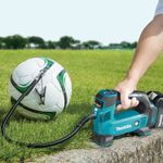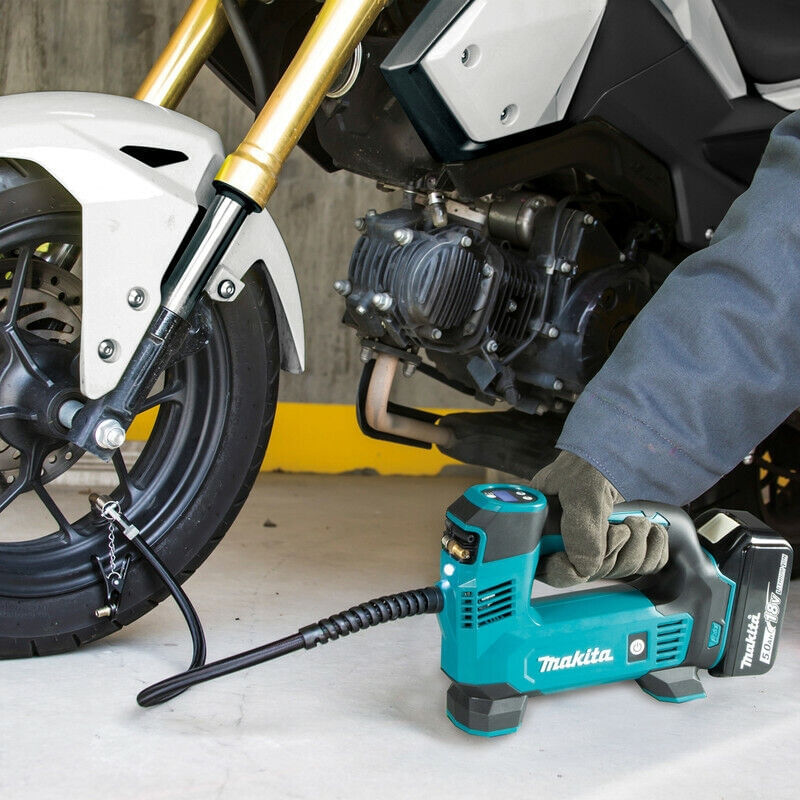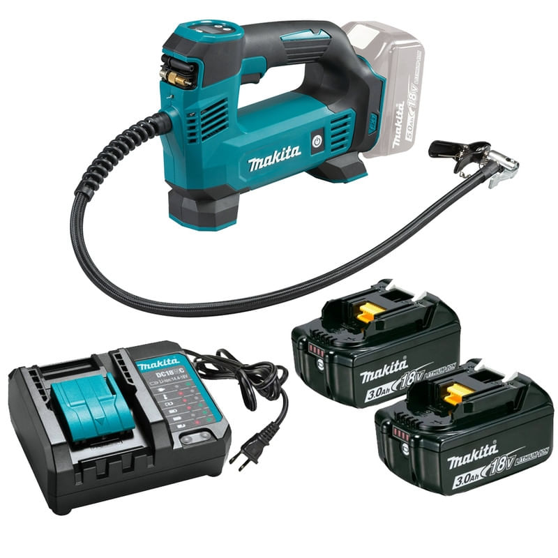 COMPRESSOR DE AR E CALIBRADOR A BATERIA 18V MAKITA DMP180Z + 02 BATERIAS DE 3,0AH + CARREGADOR BIVOLT O Compressor de ar e Calibrador DMP180Z é Ideal para encher pneus de carros, motos, bicicletas e balões.Ele possui regulador de pressão digital em kPa, PSI ou BAR.E para os locais mais escuros, o DMP180Z conta com Iluminação de trabalho. Características:Armazenamento dos bicos e mangueira é no corpo da ferramenta.O Teste foi realizado com bateria 18V 6.0 ah-Bola de Futebol (tipo 5): tempo 23s - autonomia 225 bolas-Bola de praia (30 cm): tempo 44s - autonomia 217 bolas-Pneu de carro (215/60 R16): tempo 380s - autonomia 7 pneus-Pneu de bicicleta esportiva (700 x 23 cm): tempo 40s - autonomia 82 pneus-Pneu de bicicleta aro 26: tempo 17s - autonomia 187 pneu Especificações Técnicas: Pressão de ar: 0.83MPa (120 PSI)Vazão:-Alta: 7L/min-Baixa: 12L/minNível de ruído: 70 dBNível de vibração: 3.6 m/s²Dimensões(C x L x A): 246 x 80 x 174 mmPeso: 1,33kg (Peso sem Bateria)Bateria: 18V Itens que acompanham a ferramenta: -02 Baterias 18V com 3,0Ah (BL1830B); -01 Carregador 18V bivolt (DC18WC).