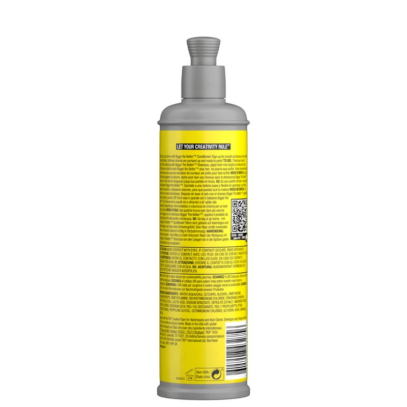 Condicionador Bed Head Bigger the Better 300ml O Condicionador Bed Head Bigger the Better foi desenvolvido especialmente para dar volume e leveza aos cabelos finos e sem vida. Sua fórmula leve e nutritiva hidrata e amacia os fios sem pesar, deixando-os mais suaves e com elasticidade natural. Também ajuda a reduzir o frizz e os fios rebeldes, garantindo um acabamento alinhado e bonito. Principais benefícios: Proporciona volume extra, ideal para cabelos finos Hidrata e nutre com leveza Ajuda no controle do frizz Deixa os fios mais brilhantes e saudáveis Facilita o desembaraço e o penteado Modo de uso: Após lavar os cabelos com o shampoo da mesma linha, aplique o condicionador do comprimento às pontas. Deixe agir por 3 a 5 minutos e enxágue bem. Para melhores resultados, use com o Shampoo Bigger the Better. Ingredientes em destaque: Óleo de coco: nutre e hidrata profundamente Queratina: fortalece a estrutura do cabelo Agente antiestático: ajuda a manter os fios alinhados Este condicionador é ideal para quem busca mais volume, movimento e leveza nos cabelos sem abrir mão da hidratação e do brilho.