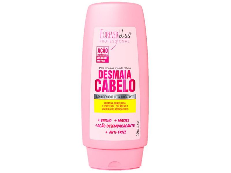 Forever Liss - Condicionador Ultra Hidratante Desmaia Cabelo 300gO Condicionador Desmaia Cabelo Forever Liss 300g age nos cabelos selando as cutículas de forma a reduzir a porosidade dos fios, deixando com aspecto mais saudável, com mais brilho e sedosidade. Ele tem ação emoliente, que desembaraça, proporciona brilho e facilita o penteado. Graças a seus ingredientes ativos, D-Pantenol, Keratina brasileira, Colágeno e Sinergia de Aminoácidos, este condicionador ainda auxilia na redução do volume e do frizz, deixando os cabelos mais alinhados e com efeito liso.- Anti frizz;- Maciez e sedosidade;- Ação desembaraçante.Sugestão de uso:1 - Após o uso do Shampoo, aplique o Condicionador Desmaia Cabelo nos cabelos molhados, massageando-os;2 - Deixe agir por 2 minutos;3 - Enxague completamente, retire o excesso de água;4 - Deixe secar naturalmente ou se preferir secar os fios com ondas de calor.O que você está comprando!01 - Condicionador Desmaia Cabelo Forever Liss - 300g.ANVISA 2.08563.325351.215044/20417-90.*Não testado em animais;*Imagens meramente ilustrativas.Composição: Aqua, Disodium EDTA, Glycerin, Cetearyl Alcohol, Cetrimonium Chloride, Cetyl Alcohol, Cetyl Lactate, BHT, Behenamidopropyl Dimethylamine, Hydrolyzed Collagen, Panthenyl Hydroxypropyl Steardimonium Chloride, Water (and) Wheat Amino Acids (and) Soy Amino Acids (and) Arginine (and) Serine (and) Threonine, BisHydroxy/MethoxyAmodimethicone, Amodimethicone (and) Cetrimonium Chloride (and) Trideceth-12, Cetyl Lactate, Grape Seed Oil Dimethiconol (and) TEA-Doodecylbenzenesulfonate, Methylchloroisothiazolinone (and) Methylisothiazolinone, Aqua (and) Parfum, Lactic Acid.