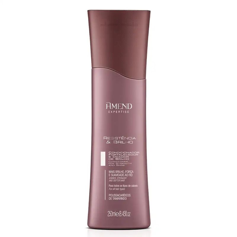 Condicionador Fortalecedor e Doador de Brilho Amend Expertise Resistência & Brilho 250mlSela as cutículas devolvendo aos cabelos instantaneamente aparência saudável. Os ativos presentes na fórmula proporcionam a revitalização e aumentam a resistência do fio, protegem criando um efeito disciplinante, evitando a formação de frizz. O cabelo fica extremamente brilhante, suave e macio, eliminando o aspecto áspero do fio e melhorando sua aparência geral.